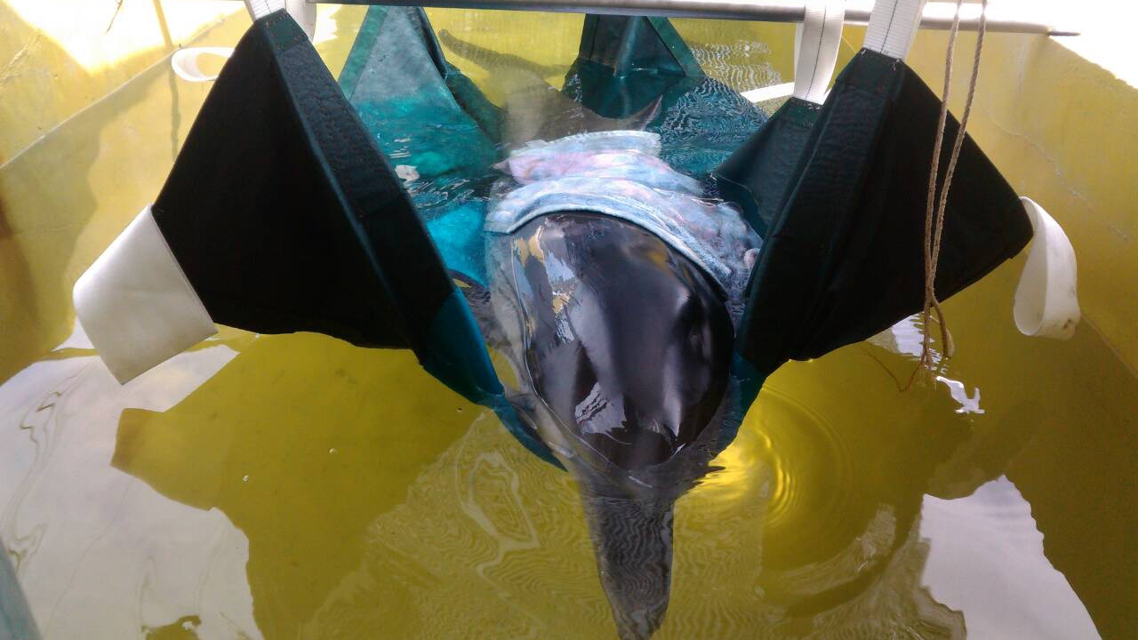 ต่อมาวันที่ 16 ก.ค. 58 เวลา 07.00 น. นายสันติ นิลวัฒน์ นักวิชาการประมงชำนาญการศูนย์วิจัยและพัฒนาทรัพยากรทางทะเลและชายฝั่งอ่าวไทยตอนล่างสถานีวิจัยและพัฒนาทรัพยากรทางทะเล (ชายฝั่งทะเลและป่าชายเลน) กรมทรัพยากรทางทะเลและชายฝั่ง เดินทางมาตรวจสอบพบว่าโลมาดังกล่าวเป็นโลมาลายแถบเพศผู้ ยาว 2.10 เมตร หนัก 150 กก. มีรอยบาดแผลตามตัวหลายแห่งและมีอาการป่วย จึงได้นำมาพักฟื้นเพื่อรอการรักษาที่ศูนย์วิจัยและพัฒนาประมงชายฝั่ง จ.สตูล ที่ อ.ละงู เพื่อรอสัตวแพทย์เฉพาะทาง มารักษาอาการ โดยโลมามีลักษณะหายใจติดขัด เจ้าหน้าที่ใช้เปลพยุงไว้ในน้ำตลอดเวลา