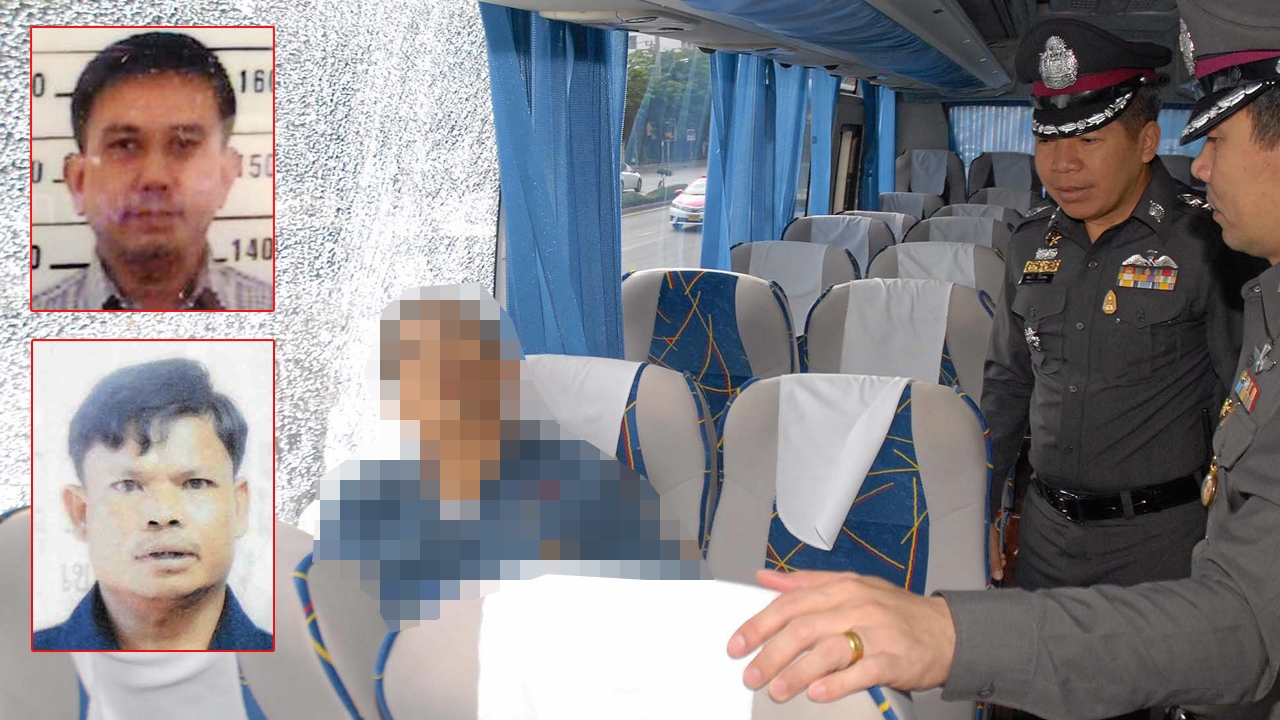นายโสภณ เจียระผกานนท์ พนักงานคอมพิวเตอร์ระดับ 7 กฟผ. (รูปบน) ถูกนายสถิตย์ จูมทอง (รูปล่าง) คนขับรถบัสรับส่งพนักงานการไฟฟ้าฉวยจังหวะคนตายนั่งหลับจอดรถริมถนนสิรินธรก่อนชักปืนยิงดับคาเบาะแล้วทิ้งรถหนี.