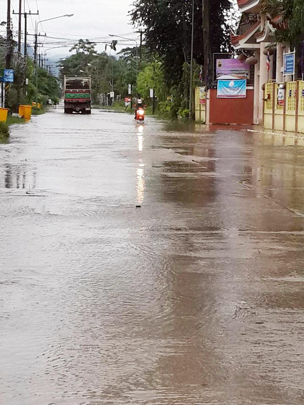 ขณะเดียวกัน จากการที่พายุฝนได้ตกหนักตลอดทั้งคืนที่ผ่านมา ทำให้เกิดน้ำท่วมหลายจุดและท่วมหนักที่บริเวณถนนสายเทศบาลนครแม่สอด กับองค์การบริหารส่วนตำบล (อบต.) พระธาตุผาแดง อ.แม่สอด จ.ตาก บริเวณหน้าโรงเรียนราษฎร์วิทยา เนื่องจากบริเวณดังกล่าวเป็นพื้นที่ต่ำ ลักษณะเป็นก้นกระทะ ประกอบกับเป็นพื้นที่ที่น้ำจากสาขาลำห้วย จะไหลไปรวมกันบริเวณจุดใกล้เคียง ทำให้น้ำท่วมขังเร็วกว่าจุดอื่น