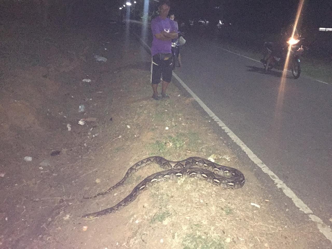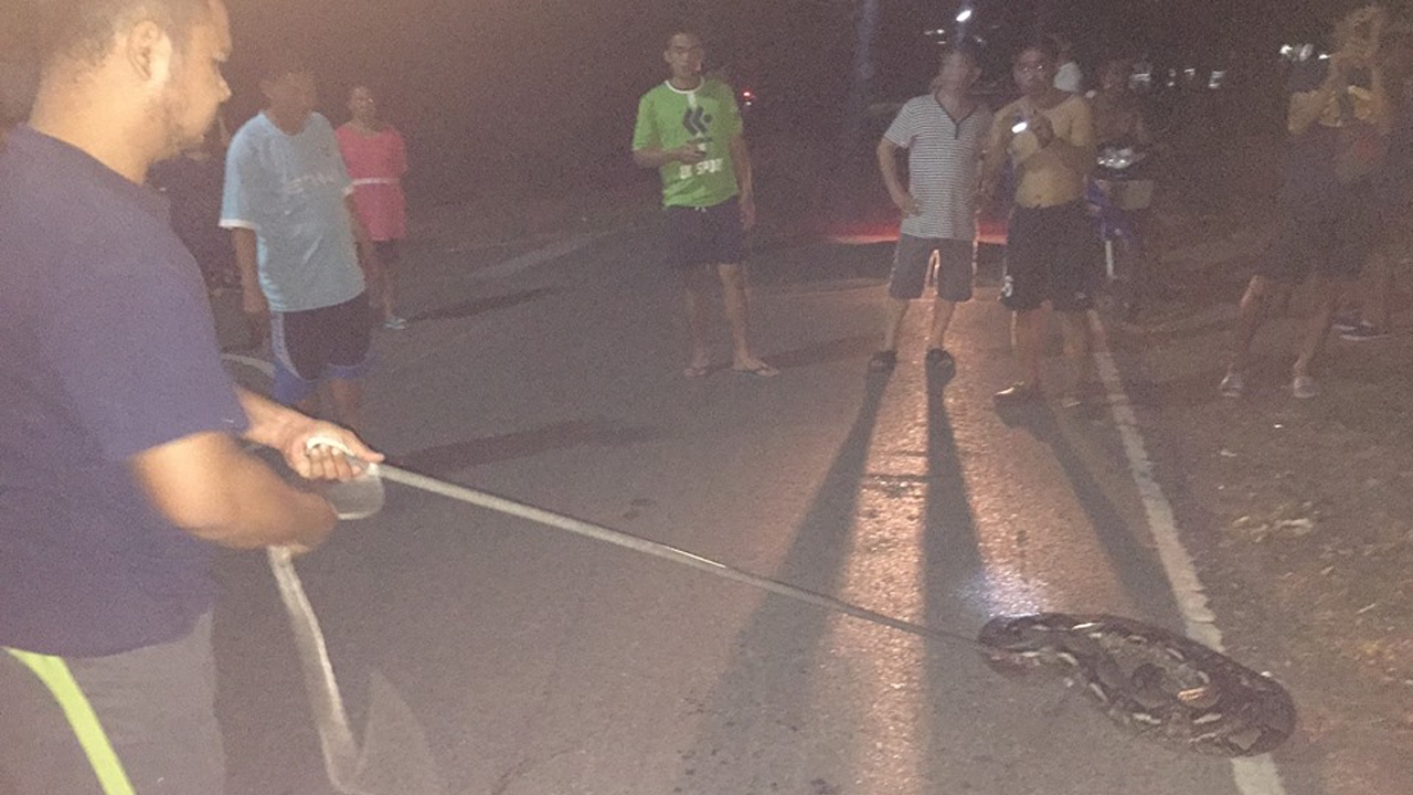 ต่อมา พบประชาชนมุงดูเป็นจำนวนมาก พบงูเหลือมขนาดใหญ่ นอนขดตัวอยู่กลางถนน ทางเจ้าหน้าที่ต้องใช้อุปกรณ์ในการจับงูคล้องที่หัว แต่งูตัวดังกล่าวสู้ ทางเจ้าหน้าที่พยายามช่วยกันจับ โดยต้องใช้เจ้าหน้าที่ถึง 3 คน ซึ่งการจับงูเหลือมตัวดังกล่าวเป็นไปด้วยความทุลักทุเล แต่สามารถจับงูได้ในที่สุด จากการตรวจสอบพบว่า งูตัวดังกล่าว ยาวประมาณ 3 เมตร หนักประมาณ 25-30 กก. จากนั้นเจ้าหน้าที่จึงนำงูเหลือมใส่กระสอบ เพื่อนำไปปล่อยคืนสู่ป่าธรรมชาติที่อยู่ห่างไกลบ้านเรือนประชาชนต่อไป