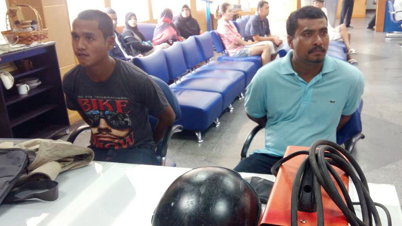 จนกระทั่งเวลา 11.16 น. หลังจากผ่านไปเพียง 11 นาที สายตรวจรถจักรยานยนต์พบรถและชายต้องสงสัยกำลังขี่รถอยู่บริเวณใกล้สำนักงานพาณิชย์จังหวัดภูเก็ต ถ.พังงา ต.ตลาดใหญ่ อ.เมืองภูเก็ต จึงเข้าตรวจสอบจับกุมตัว ทราบชื่อ คือ นายพลัฎฐ์ คงทอง อายุ 29 ปี และนายธนภัทร เหล่หมุด อายุ 21 ปี ชาว อ.เมืองกระบี่ และ อ.เมืองตรัง พร้อมของกลางเครื่องเชื่อม 1 เครื่อง