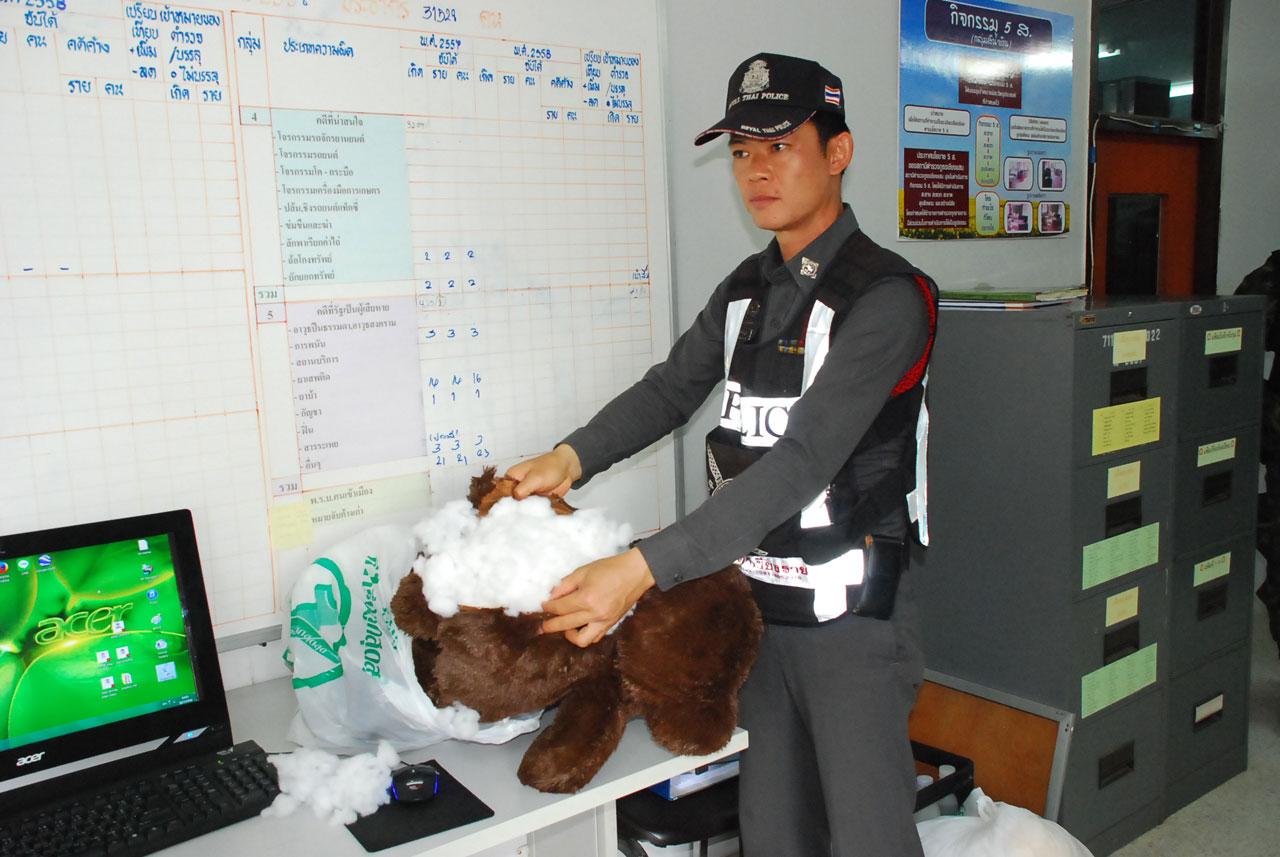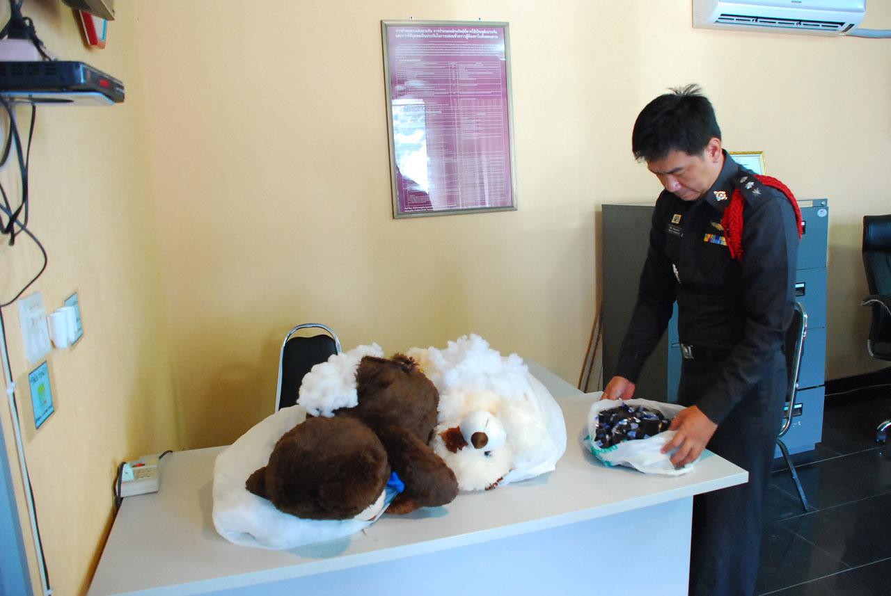 ขณะตรวจได้มีรถแท็กซี่ สีน้ำเงินเหลือง ทะเบียน ทข 93 เชียงราย ขับมาจาก อ.แม่สาย มุ่งหน้าเข้า อ.เชียงแสน ภายในรถมีผู้โดยสารเป็นหญิงสาว 3 คน เจ้าหน้าที่ได้ให้สัญญาณหยุด จากการตรวจค้นกระโปรงท้ายรถพบตุ๊กตาหมี 2 ตัว อยู่ในถุงพลาสติก เจ้าหน้าที่ยกตุ๊กตาหมีทั้งสองรู้สึกหนักผิดปกติ สังเกตหญิงทั้งสามคนมีท่าทางพิรุธ จึงได้ผ่าท้องตุ๊กตาหมี ภายในมียาบ้าซุกซ่อนอยู่จำนวน 20,000 เม็ด