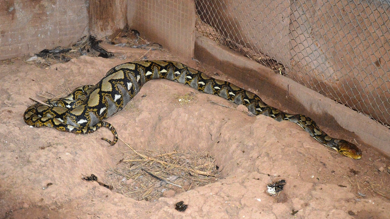 ครูหนุ่มวิทยาลัยสารพัดช่างน่าน ซื้อแม่ไก่ชนพันธุ์ดีราคากว่า 1 หมื่นมาเลี้ยงเพาะลูกขาย ถูกงูเหลือมเลื้อยเข้ากรงมาเขมือบกินแม่ไก่จนท้องป่อง เลื้อยออกไม่ได้ นอนนิ่งในกรง ต้องแจ้งกู้ภัยจับไปปล่อย บอกงูเยอะมาก กินไก่ไปแล้วกว่า 10 ตัว...