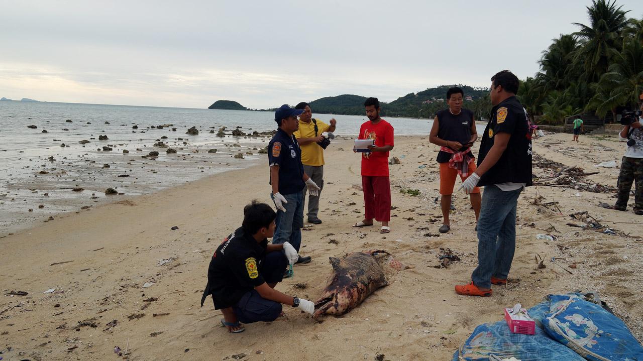 เมื่อเวลา 17.10 น.วันที่ 21 ก.ค.58 อาสาสมัครมูลนิธิกุศลสงเคราะห์เกาะสมุย ได้รับแจ้งจากชาวบ้านที่พักอาศัยอยู่บริเวณริมชายหาด บ้านบางมะขาม ม.5 ต.อ่างทอง อ.เกาะสมุย จ.สุราษฎร์ธานี ว่า พบซากโลมาถูกคลื่นซัดมาเกยตื้นตายอยู่บริเวณชายหาด จึงได้เดินทางไปตรวจสอบ บริเวณชายหาด บพซากโลมาปากขวด คาดว่าน่าจะเป็นเพศเมีย ความยาว 172 เซนติเมตร น้ำหนักประมาณ 70 กิโลกรัม อายุประมาณ 3-4 ปี คาดน่าจะตายมาแล้วประมาณ 4-5 วัน จากการตรวจสอบบริเวณลำตัวของโลมา ที่บริเวณโคนหางมีรอยช้ำ และบริเวณกลางลำตัวมีบาดแผล จากรอยถูกแทงด้วยของแหลมจนเป็นรูลึก อาสาสมัครกู้ภัยจึงได้เก็บตัวอย่างชิ้นเนื้อของซากโลมา เพื่อส่งไปให้เจ้าหน้าที่ประมงชายฝั่ง จ.ชุมพร ตรวจสอบ ก่อนที่จะมีการฝังกลบซากโลมาไว้บริเวณชายหาดเพื่อรอเจ้าหน้าที่มาตรวจสอบ