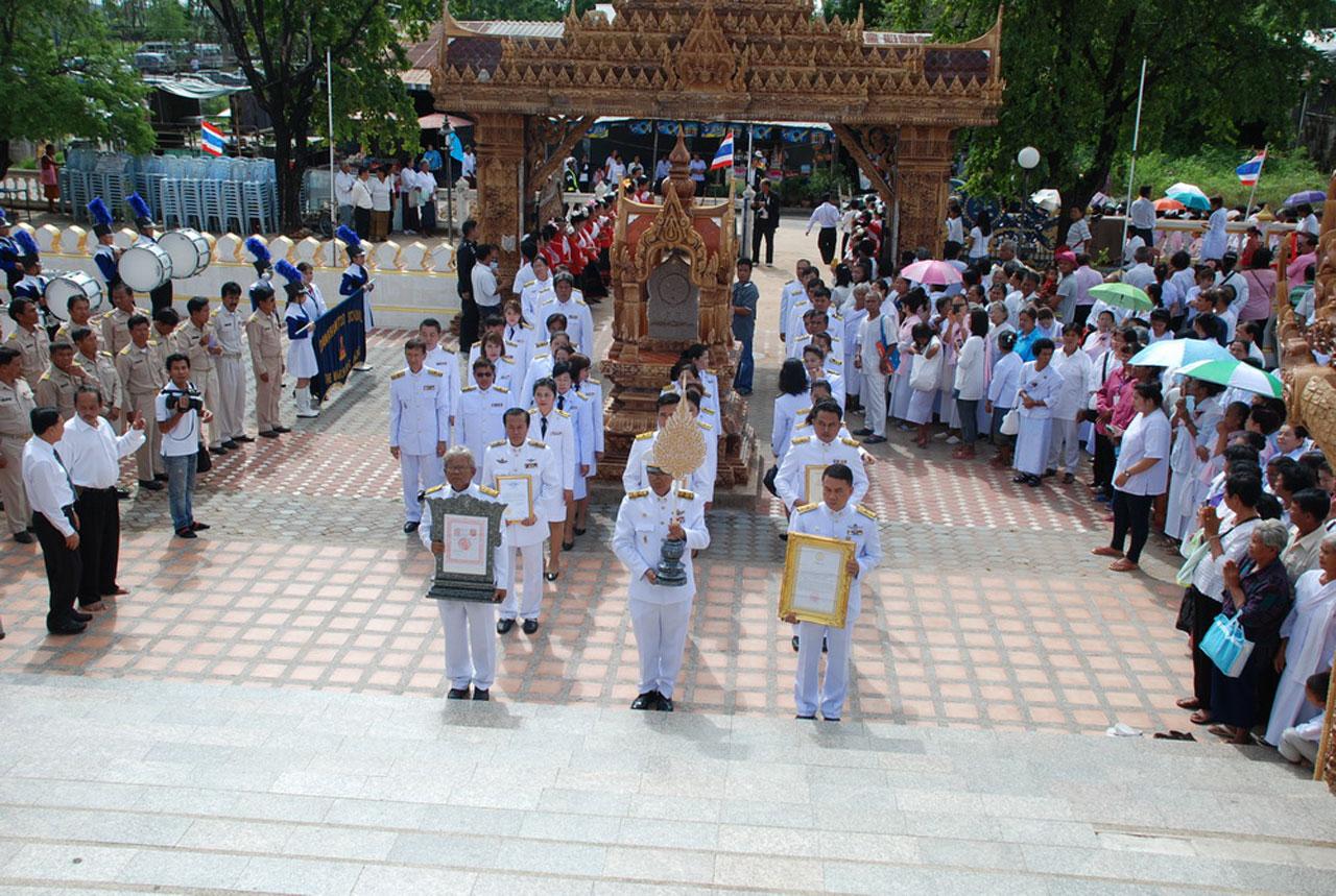 ทั้งนี้ มีการตั้งขบวนแห่ตราตั้ง และพระภาวนาประชานาถ เดินทางเข้าวัดบ้านไร่อย่างยิ่งใหญ่ มีทั้งขบวนนางรำจากกลุ่มแม่บ้าน ข้าราชการ พ่อค้า ประชาชนร่วมขบวนยาวเหยียด หลังจากนั้นมีการจัดแสดงทักษิณานุประทาน ผ้าไตรพระราชทานจากพระบาทสมเด็จพระเจ้าอยู่หัว จำนวน 32 ไตร พระสงฆ์สมณศักดิ์พิจารณาผ้าบังสุกุล ประธานฝ่ายฆราวาสจุดธูปเทียนบูชาพระรัตนตรัย และดำเนินการตามขั้นตอนทางศาสนา