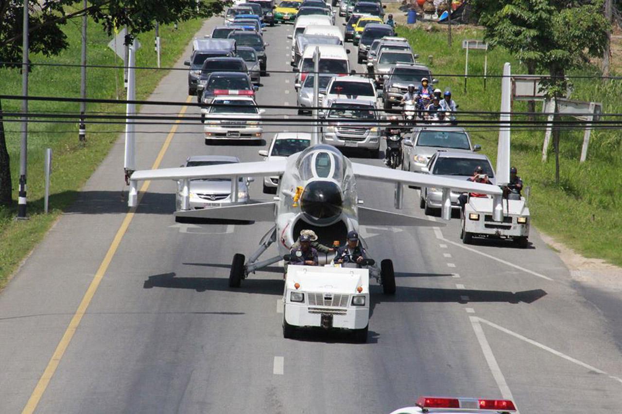 ซึ่งการลำเลียงเครื่องบินเป็นไปด้วยความยากลำบาก ทางกองการบินทหารเรือ ได้ใช้รถลากเครื่องบิน และปิดเส้นทางการจราจรตลอดสาย เพราะเครื่องบินมีปีกที่กว้างและกลัวเกิดความอันตรายกับผู้ใช้เส้นทางจราจร ซึ่งสร้างความตื่นตาตื่นใจให้กับประชาชนผู้พบเห็นอย่างมาก ต่างพากันหยิบกล้องถ่ายรูป ขึ้นมาถ่ายเก็บภาพไว้เป็นที่ระลึก ที่ครั้งหนึ่งในชีวิต ได้มีโอกาสเห็นเครื่องบินรบวิ่งบนถนนหลวง ทั้งนี้ใช้ระยะเวลานานกว่า 3 ชั่วโมง เครื่องบินได้ถูกเคลื่อนย้ายถึงที่หมายอย่างปลอดภัย