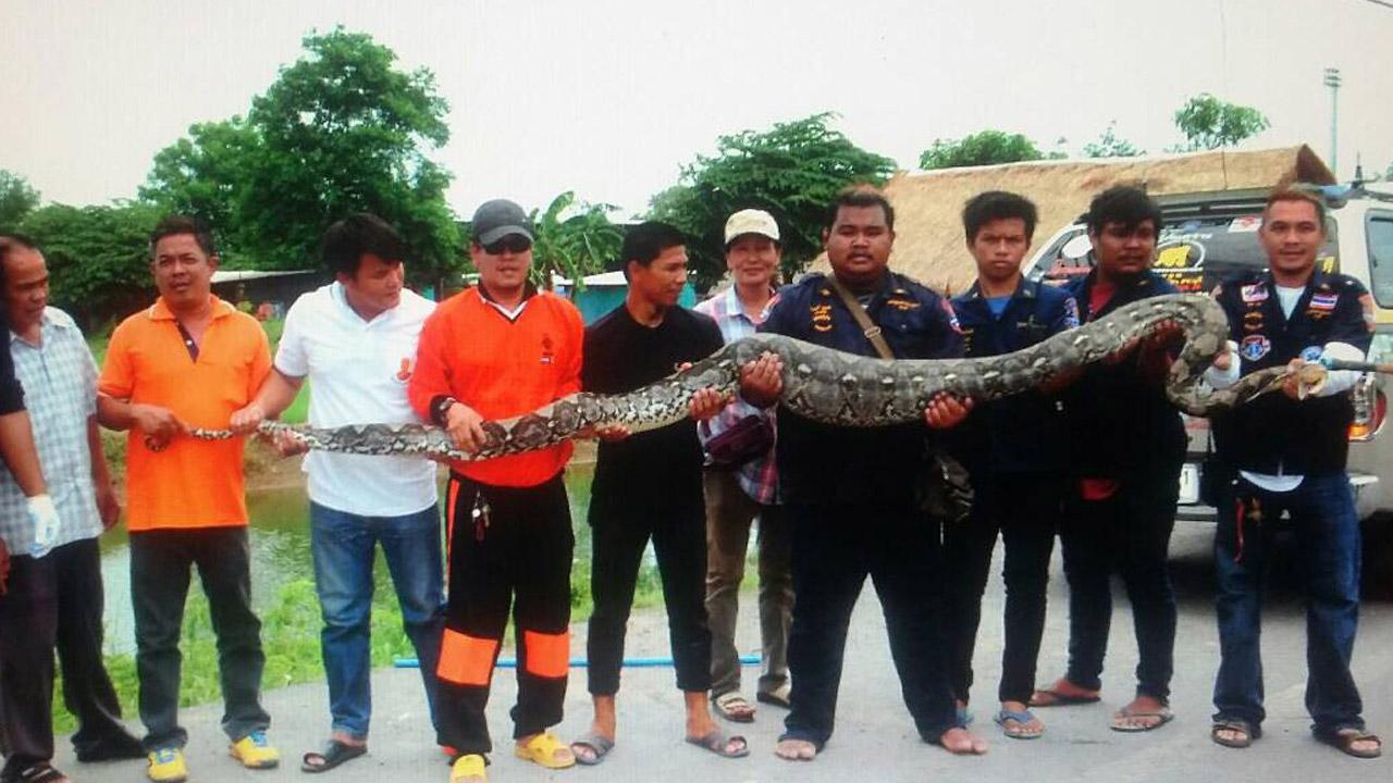 พบมีลูกค้าที่มานั่งกินอาหารกำลังมุงดูสิ่งมีชีวิตที่เลื้อยวนไปมาอยู่ในน้ำ เมื่อเห็นลายบนตัว เจ้าหน้าที่ก็ลงความเห็นว่าเป็น งูหลาม แต่เป็นงูหลามที่มีขนาดใหญ่มาก ความยาวกว่า 4 เมตร แน่นอน ต้องใช้คนถึง 5-6 คน ช่วยกันดึงงูยักษ์ออกมาจากใต้ถุนร้านได้สำเร็จ เป็นงูหลามเพศเมีย วัดความยาวได้ 4.7 เมตร น้ำหนักประมาณ 80 กิโลกรัม เจ้าหน้าที่จึงนำขึ้นรถกู้ภัยไปปล่อยคืนสู่ธรรมชาติต่อไป