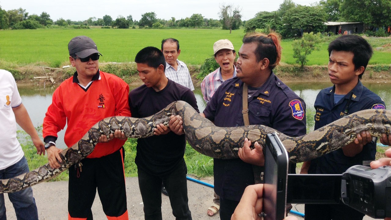 มันมาอีกแล้ว งูหลามขนาดใหญ่กำลังเขมือบตัวเงินตัวทองอยู่ริมถนนหน้าร้านอาหาร เจ้าของร้านกับลูกน้องไปเจอ งูเลื้อยหนีลงน้ำ ว่ายวนไปมาดูคล้ายอนาคอนด้าเพราะตัวใหญ่มาก เรียกกู้ภัยมาจับ เป็นตัวเมียยาว 4.7 เมตร หนัก 80 กก.