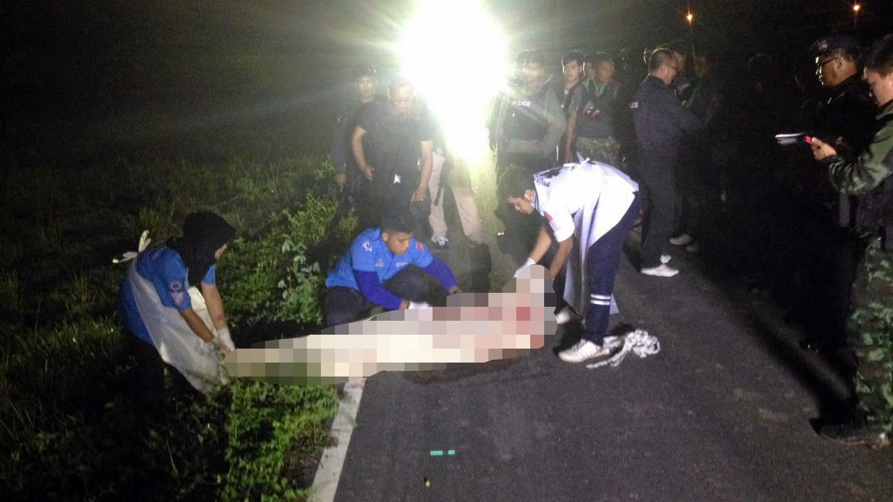 ที่เกิดเหตุ อยู่บริเวณริมทุ่งนา บนถนนทางเข้าหมู่บ้าน พบศพชายไทยวัยราว 30-35 ปี สวมเสื้อแจ็กเก็ตสีน้ำตาล เสื้อยืดสีส้ม นุ่งกางเกงยีนส์ ถูกยิงด้วยอาวุธปืนขนาด 9 มม. ที่ศีรษะ 3 นัด และต้นขาขวาใกล้หัวเข่าอีก 1 นัด นอนตายจมกองเลือดอยู่บนพื้น ไม่พบหลักฐานว่าเป็นใคร ไม่มีร่องรอยการต่อสู้ในที่เกิดเหตุ พบทรัพย์สินในตัวมีโทรศัพท์มือถือซัมซุงกาแล็กซี่ กุญแจรถจักรยานยนต์ฮอนด้า หวี และปากกาแสงชี้กระดานบอร์ด จึงได้เก็บรวบรวมไว้เป็นหลักฐาน