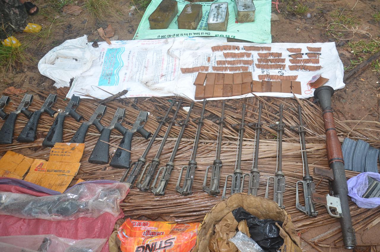เบื้องต้น พบเป็นอาวุธปืนสงคราม ประกอบด้วย M16 A1 จำนวน 8 กระบอก (ไม่มีลูกเลื่อน), M16 A1 มีเฉพาะชุดโครงนำลูกเลื่อน 1 ชุด, ปืนกลจาน RPD จำนวน 2 กระบอก, M79 จำนวน 1 กระบอก, RPG -7 จำนวน 1 กระบอก, ซองบรรจุกระสุน M16 (ขนาดบรรจุ 30 นัด) จำนวน 9 ซอง, ซองกระสุน M16 (ขนาดบรรจุ 20 นัด) จำนวน 3 ซอง, ซองบรรจุกระสุน อาก้า จำนวน 1 ซอง, จานบรรจุกระสุนปืนกล RPD จำนวน 2 จาน, กระสุนปืน ชนิด AK-47 ขนาด 7.62 มม. จำนวน 3,240 นัด ซึ่งคาดว่า ขณะที่เจ้าหน้าที่ทหารออกลาดตระเวน กลุ่มคนร้ายไหวตัวทัน จึงทิ้งของกลาง ก่อนแยกย้ายกันหลบหนีไป