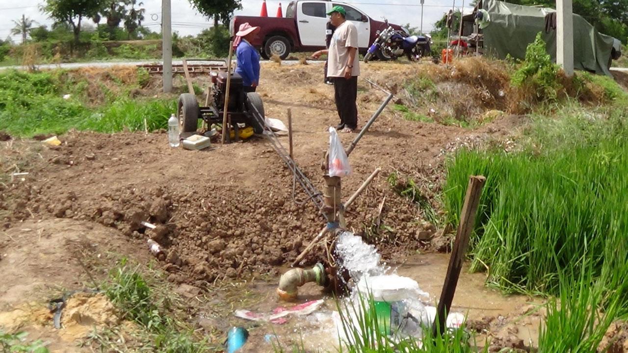ชาวนาอ่างทอง รอรัฐบาลไม่ไหว! ลงทุนจ้างคนมาเจาะบ่อบาดาลด้วยมือสู้ภัยแล้ง หลังข้าวใกล้ตายจึงจำเป็นต้องดิ้นรนกู้เงินญาติไปลงทุน เผยเสียเงินบ่อละ 12,000 บาทขึ้นไป ถ้ายังไม่เจอน้ำต้องบวกเงินเพิ่มอีกวาละ 500 บาท