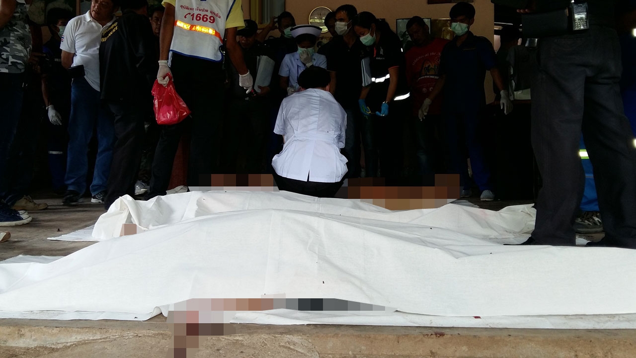 ที่เกิดเหตุเป็นบ้าน 2 ชั้น ครึ่งปูนครึ่งไม้ บริเวณทางเข้าห้องน้ำชั้นล่าง พบศพ นายจิตร อ่อนคำ อายุ 56 ปี เจ้าของบ้าน ถูกแทงด้วยของมีคมที่หน้าอก 3 แผล ด้านหลัง 1 แผล และชายโครงขวา 1 แผล สภาพนอนหงายจมกองเลือด บริเวณในห้องนอนใกล้กันยังพบศพชายหญิงนอนตายกันเกลื่อนอีก 3 ศพ คือ นางทองแดง อ่อนคำ อายุ 56 ปี ภรรยานายจิตร, นางประหยัด พวงทรัพย์ อายุ 62 ปี (พี่สาวนางทองแดง) และศพนายสมคิดหรืออู๋ อ่อนคำ อายุ 31 ปี ลูกชายเจ้าของบ้าน สวมเสื้อเชิ้ตลายทางสีแดงขาว สวมกางเกงกีฬาขาสั้นสีดำ มีรอยถูกของมีคมปาดที่ลำคอเป็นแผลเหวอะหวะ 1 แผล ที่หน้าท้องอีก 5 แผล โดยพบมีดพกปลายแหลมยาวประมาณ 1 ฟุต ตกอยู่ในที่เกิดเหตุ 1 เล่ม มีร่องรอยต่อสู้จนข้าวของกระจัดกระจาย
