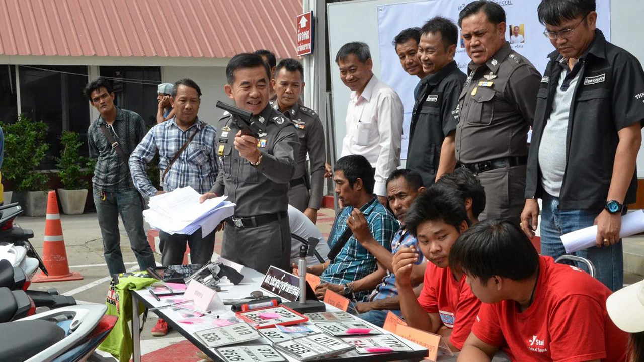 พล.ต.ต.มนตรี ยิ้มแย้ม ผบก.ภ.จ.ปทุมธานี โชว์ปืนของกลางขณะแถลงข่าวจับกุมนายชัชวาล ยอดแก้ว และพวกรวม 10 คน ตั้งแก๊งขโมยรถในพื้นที่ จ.ปทุมธานี และจังหวัดใกล้เคียงแล้วนำไปขายตามชายแดนประเทศเพื่อนบ้าน.