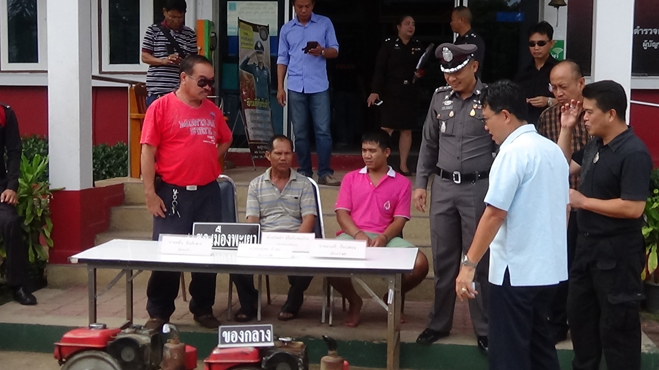 เมื่อวันที่ 5 ส.ค. 58 ว่าที่ ร.ต.สมัย คำชมพู นายอำเภอเมืองพะเยา พ.ต.อ.ประจัญ ปัญญาแก้ว ผกก.สภ.เมืองพะเยา พ.ต.ท.เฉลิมชาติ ยาวิชัย รอง ผกก.สส. พ.ต.ท.จารุวัจน์ สุปินะ สว.สส. และชุดสืบสวน สภ.เมืองพะเยา แถลงการจับกุมแก๊งขโมยหัวรถไถสูบน้ำเข้านา 2 เครื่อง ผู้ต้องหา 3 คน หลังจากที่ร่วมกันลักทรัพย์และรับซื้อของโจร มีนายหลั่น อินต๊ะสาร หรือนายคำรณ อายุ 53 ปี นายยงยุทธ ค้าสม อายุ 58 ปี และนายมนตรี เรือนสอน อายุ 28 ปี ชาวจังหวัดพะเยา พร้อมของกลางหัวรถไถนาที่ขโมยมาจำนวน 2 เครื่อง