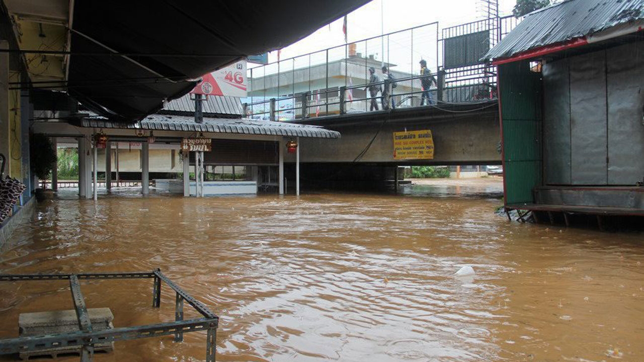 ส่วนสถานการณ์น้ำท่วมบริเวณด่านพรมแดนแม่สาย-เมียนมา อ.แม่สาย จ.เชียงราย หลังน้ำป่าไหลมาตามแม่น้ำสาย เอ่อท่วมเป็นวงกว้าง ทำให้ร้านค้าไม่สามารถเปิดให้บริการได้ ล่าสุดระดับน้ำลดลงเข้าสู่ภาวะปกติแล้ว แต่ได้ทิ้งซากดินโคลนไว้เป็นจำนวนมาก บรรดาพ่อค้าแม่ค้าต่างออกมาทำความสะอาด อย่างไรก็ตาม แม้สถานการณ์น้ำท่วมจะคลี่คลาย แต่ระดับน้ำในแม่น้ำสายยังสูงกว่า 3 เมตร ท้องฟ้ายังมืดและมีฝนตกลงมาเป็นระยะ ทำให้มีโอกาสเกิดน้ำป่าไหลหลากได้อีก เทศบาลแม่สายยังไม่รื้อบังเกอร์กั้นน้ำออก พร้อมเตือนประชาชนและร้านค้าเก็บทรัพย์สินไว้บนพื้นที่สูงเพื่อความปลอดภัย