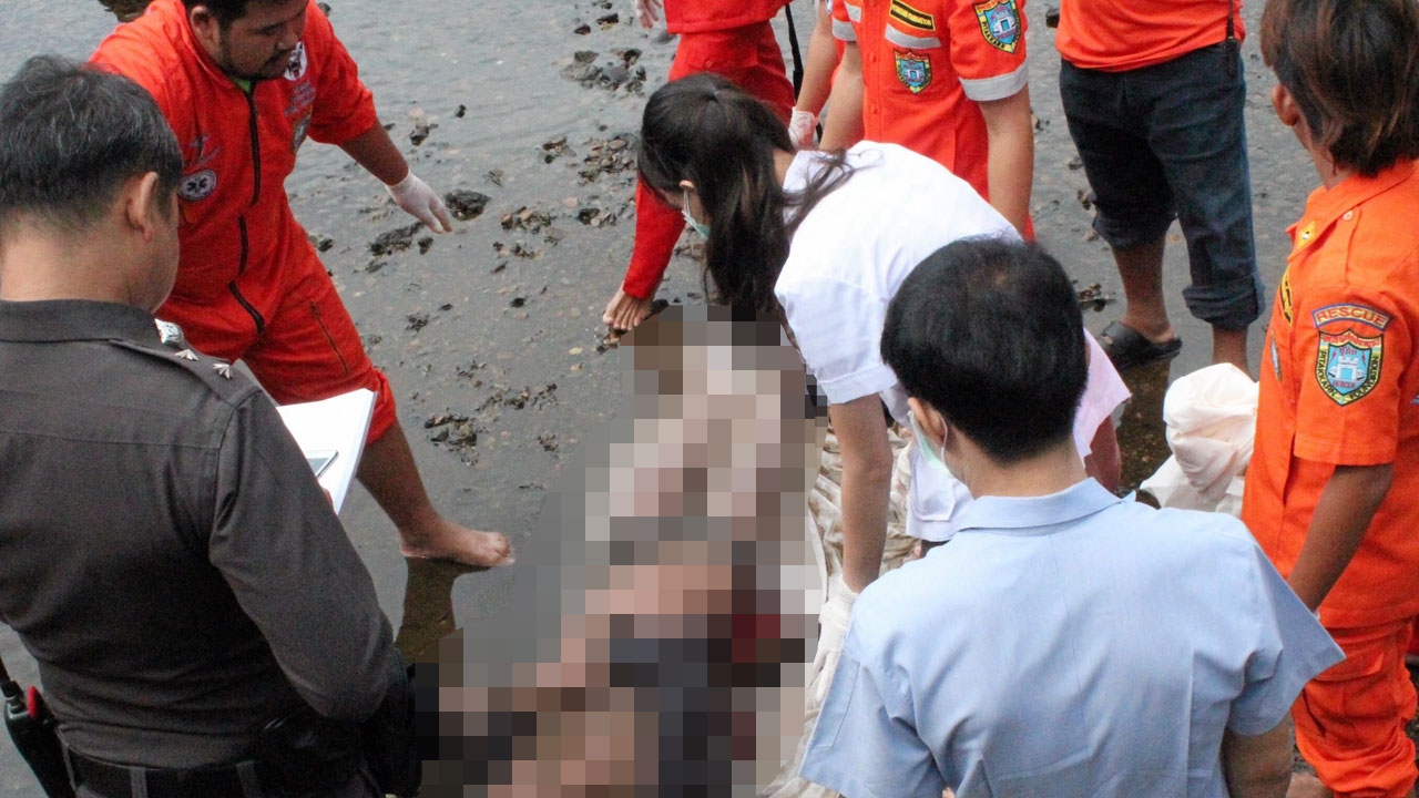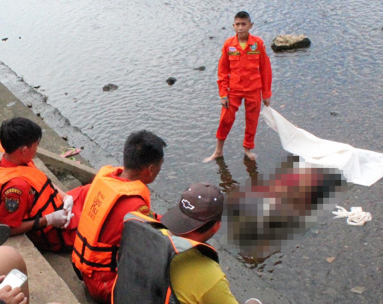 จุดเกิดเหตุอยู่กลางแม่น้ำแควใหญ่ พบผู้เสียชีวิตเป็นชายคว่ำหน้าลอยน้ำอยู่บริเวณตอม่อช่วงกลางสะพาน เมื่อเจ้าหน้าที่มูลนิธิฯ นำเรือออกไปลากศพเข้าฝั่งพบว่า ลำคอศพมีเชือกผูกติดกับก้อนหินถ่วงไว้ จึงใช้มีดตัดเชือกทิ้งแล้วนำศพขึ้นฝั่งให้ตำรวจกับแพทย์ชันสูตร สภาพศพถูกห่อด้วยผ้าห่มสำลีมัดด้วยเชือก ศีรษะถึงลำคอมีผ้าขนหนูปิดคลุมและมัดเชือกไว้แน่น ผู้ตายสวมเสื้อกล้ามสีน้ำตาล คลุมทับด้วยเสื้อแขนยาวลายสก็อตสีน้ำตาลเข้ม นุ่งกางเกงขายาวสีดำ โคนขาทั้ง 2 ข้างมีรอยสักรูปนก ศีรษะด้านหลังมีบาดแผลถูกฟันด้วยของมีคม 2 แผลฉกรรจ์ แก้มซ้ายและใบหน้ามีร่องรอยถูกตีด้วยของแข็งจนบวมปูด จมูกและริมฝีปากแตก