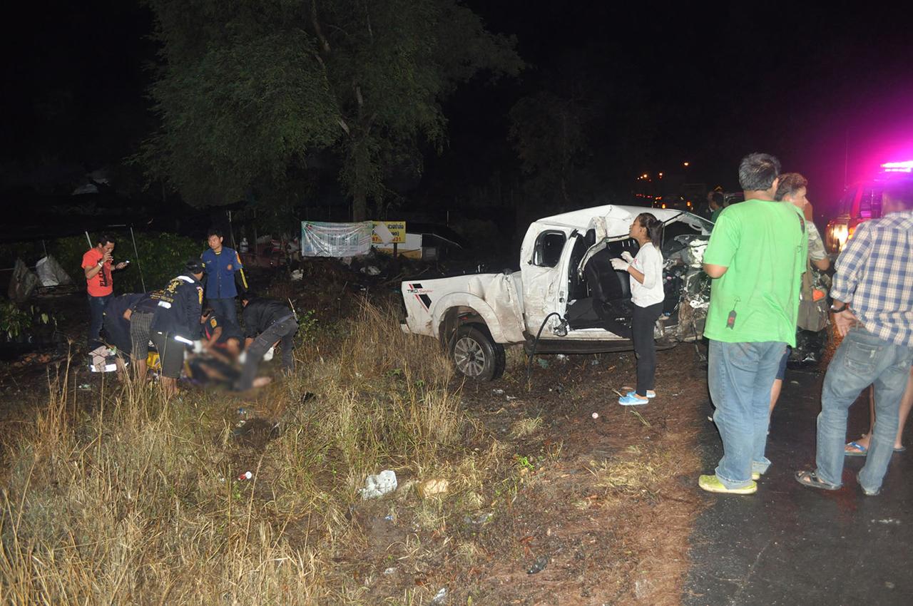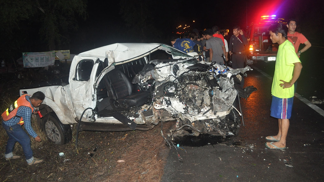 หนุ่มสุโขทัย ซิ่งรถกระบะฝ่าสายฝนจาก อ.หลังสวน ชุมพร มุ่งหน้า สุราษฎร์ธานี ถนนลื่นรถเสียหลักชนต้นไม้ข้างทางหวิดดับ อาการสาหัส