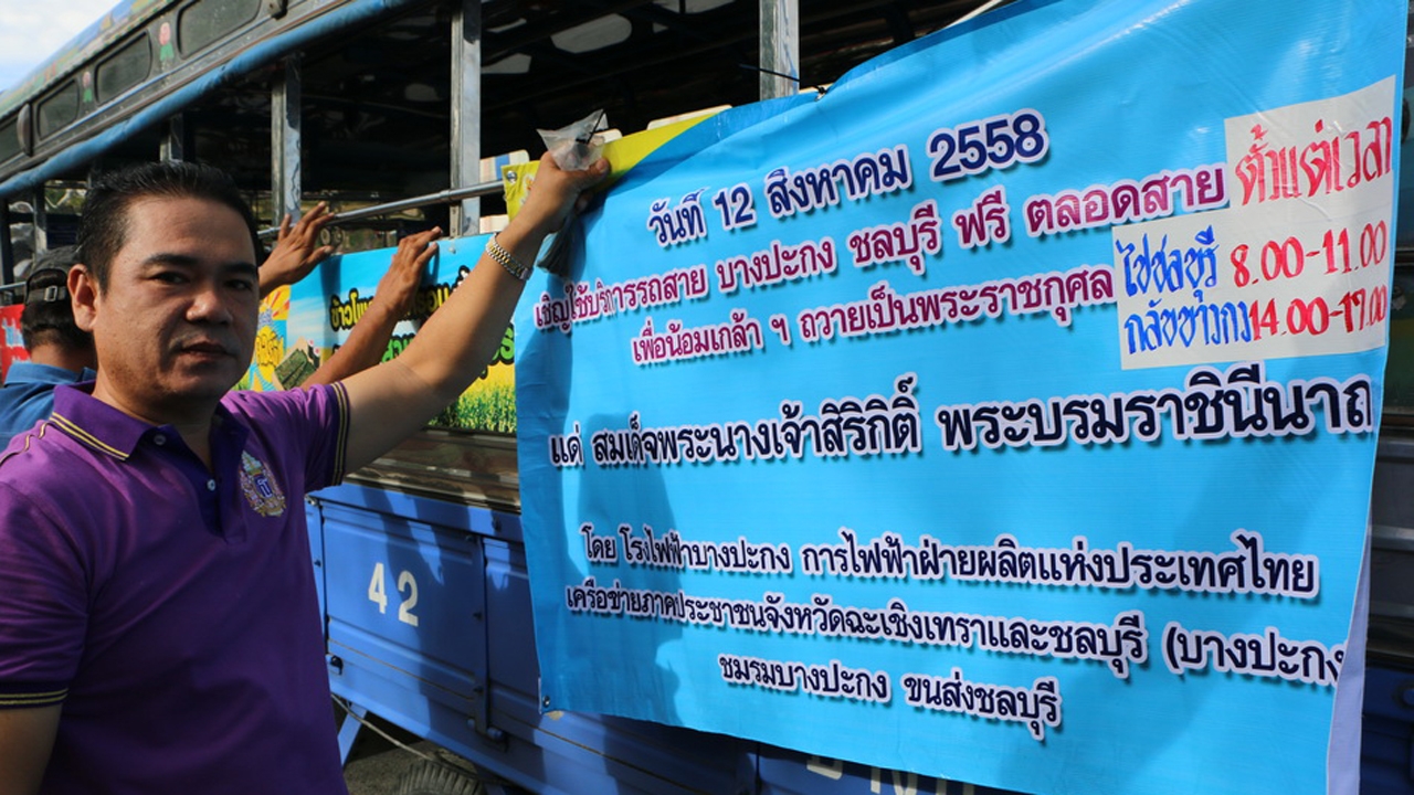 เมื่อวันที่ 10 ส.ค. 58 ที่ จ.ฉะเชิงเทรา นายนพพร ทองคำ อายุ 48 ปี หนึ่งในกลุ่มคนขับรถสองแถวสายบางปะกง-ชลบุรี ได้มีแนวคิดร่วมกับเพื่อนในกลุ่มคนขับรถสองแถวสายเดียวกันว่าในวันที่ 12 สิงหาคม 2558 วันแม่ปีนี้ จะวิ่งรถรับส่งฟรีตลอดสาย ตั้งแต่เวลา 08.00-11.00 น. ขาไปชลบุรี และ 14.00-17.00 น. ขากลับบางปะกง เพื่อน้อมเกล้าฯ ถวายเป็นพระราชกุศลแด่สมเด็จพระนางเจ้าสิริกิติ์ พระบรมราชินีนาถ