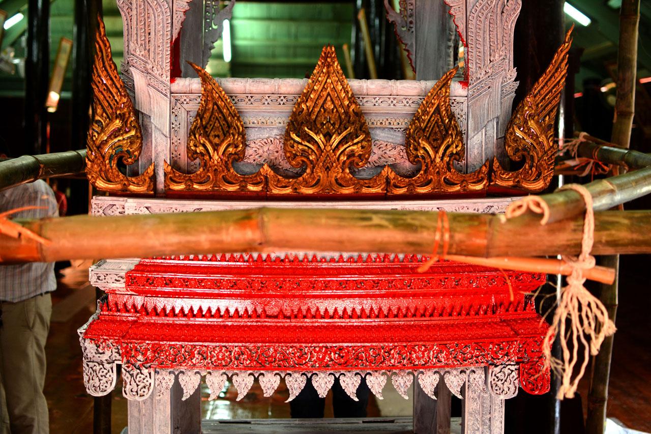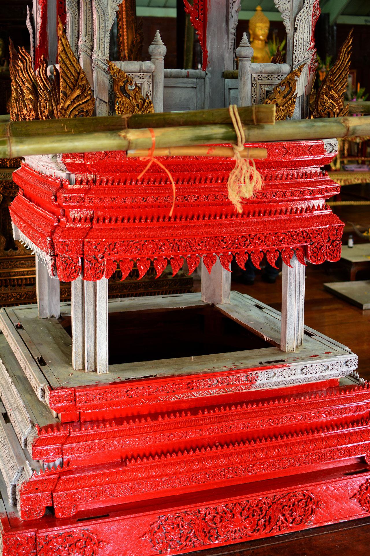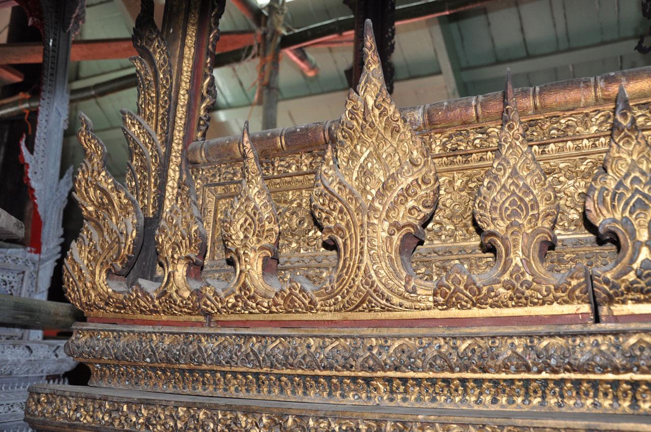 ทั้งนี้ ตัวคูหาของธรรมาสน์ จำหลักเป็นลายฉลุโปร่ง ลายเทพพนม ล้อมรอบด้วยก้านขด เส้นคิ้วของคูหาเรียวเล็กที่แสดงให้เห็นถึงฝีมือล้ำเลิศ กระจังมุมและกระจังปฏิญาณเรียงซ้อนลึกถึง 4 ชั้น แต่ละชั้นซับซ้อนละเอียดยิบ ยอดของกระจังขึ้นยอดด้วยลายกนก พริ้วเหมือนเคลื่อนไหวได้ คันทวยหรือค้ำยันย่อส่วนมาจากคันทวยวัดสระบัว อ.เมืองเพชรบุรี เล็กกะทัดรัดและละเอียดอ่อนจนแทบไม่น่าเชื่อว่าจะจำหลักได้ ส่วนล่องถุนธรรมาสน์ทั้ง 4 ด้านคือส่วนที่หายไปก่อนหน้านี้ จำหลักเป็นเรื่องราวของทศชาติชาดก แสดงความใกล้ไกลด้วยตำแหน่งภาพแบบ 3 มิติ ในไม้กระดานแผ่นเดียว โดยเฉพาะล่องถุนด้านหน้าเป็นภาพจันทกุมารจะถูกบูชายัญ ล้วนเป็นฝีมือของช่างในทีมงานของขุนศรีวังยศ