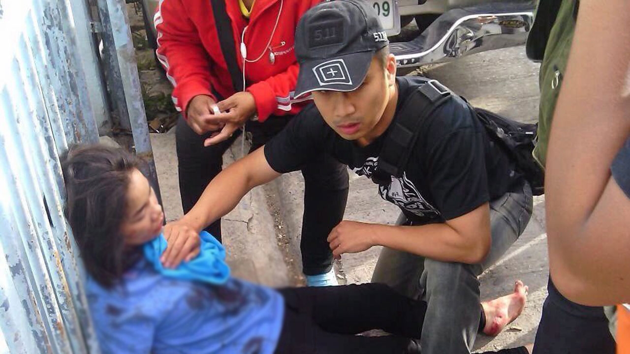 เจ้าหน้าที่มูลนิธิป่อเต็กตึ๊งใช้ผ้าปิดบาดแผลห้ามเลือดช่วยชีวิต น.ส.วิมล อ่อนศรี เพื่อนำส่ง รพ.ภูมิพลฯ หลังถูกนายสุวัตร สีทอง พ่อค้าขายก๋วยเตี๋ยวย่านวัดไผ่เขียว ดอนเมือง ใช้ปืนลูกซองสั้นจ่อยิง ก่อนมือปืนรายนี้ใช้ปืนกระบอก เดียวกันยิงอกปลิดชีพตัวเอง เหตุเกิดจากฝ่ายชายตามง้อขอคืนดีไม่สำเร็จ.