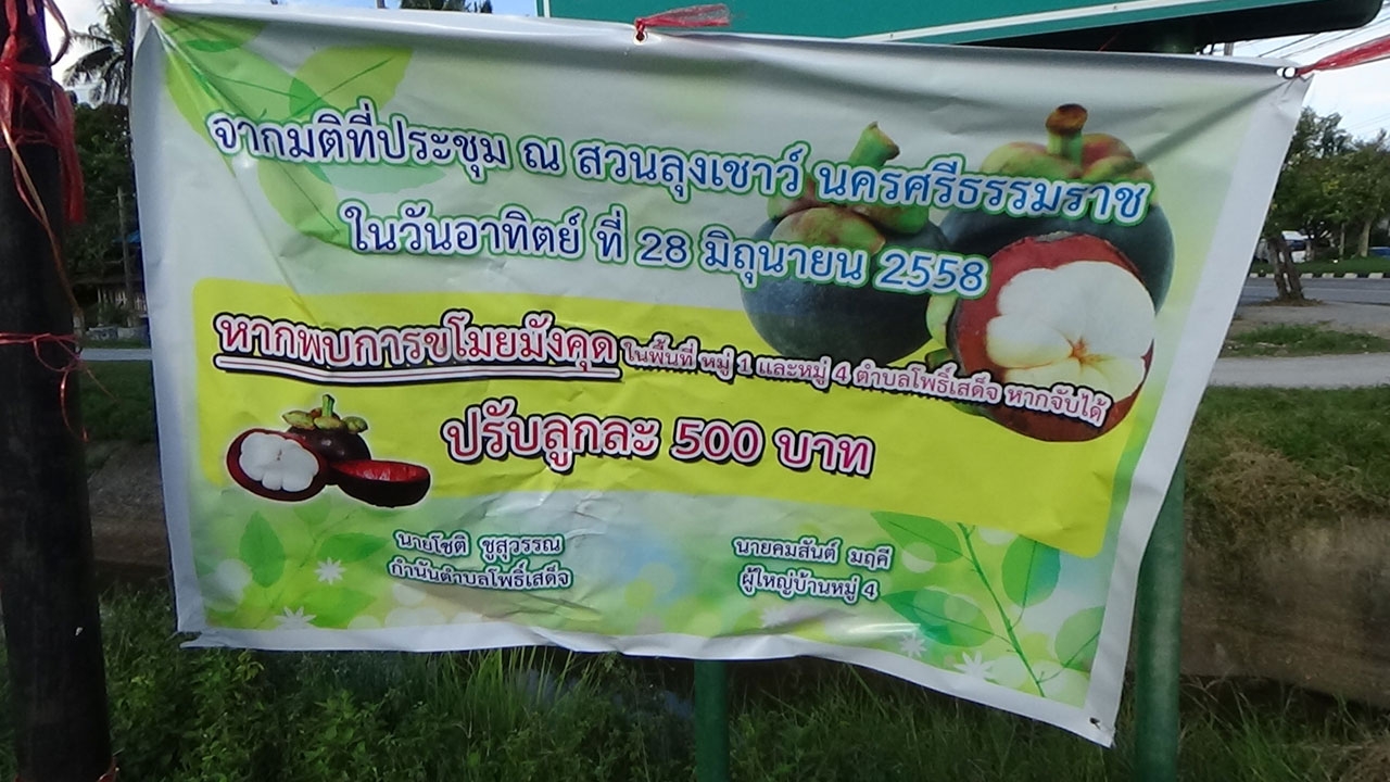 เมื่อวันที่ 11 ส.ค. 58 ผู้สื่อข่าวรายงานจาก จ.นครศรีธรรมราช กรณีมีโจรเข้าไปขโมยมังคุดในสวนไปจำนวนมากในปีนี้ โดยได้เดินทางไปตรวจสอบในพื้นที่ ต.โพธิ์เสด็จ อ.เมืองนครศรีธรรมราช พบว่ามีการติดแผ่นป้ายประกาศริมถนนตามสี่แยกต่างๆ ในตำบล ถึงมาตรการจับและปรับผู้ที่ขโมยมังคุดตามสวนต่างๆ ในอัตราลูกละ 500 บาท ป้ายดังกล่าวระบุชื่อกำนัน และผู้ใหญ่บ้านเป็นผู้ประกาศ