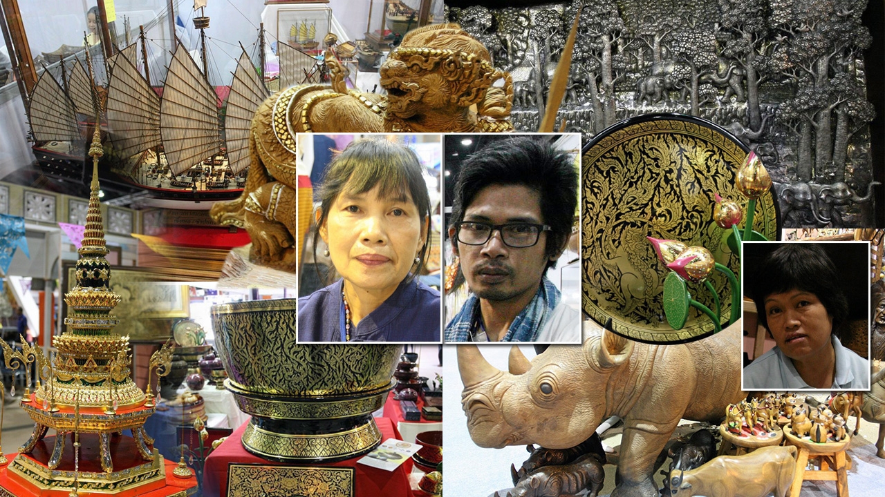 งานฝีมือคนไทยละเอียดอ่อนประณีตไม่แพ้ชาติใดในโลก เดินมาถึงบูธประติมากรรม “ไม้แกะสลัก” บ้านหลุก ตำบลนาครัว อำเภอแม่ทะ จังหวัดลำปาง ภูมิปัญญาเก่าแก่ที่สืบทอดกันมาจากรุ่นสู่รุ่น มีการพัฒนารูปแบบให้หลากหลายมากขึ้น แปลกใหม่น่าสนใจรับกับความต้องการของตลาด อาทิ งานไม้แกะสลักพระรามรบทศกัณฐ์ ได้แรงบันดาลใจมาจากโขนเรื่องรามเกียรติ์, ม้าโคมไฟ, กวางทอง, หนุมานทดน้ำ, กระบุงโขลงช้างใต้ร่มไม้, รูปสัตว์ต่างๆทั้งขนาดเล็กขนาดใหญ่ ช้าง ม้า สิงโต แรด... ขนาดเกือบเท่าตัวจริง