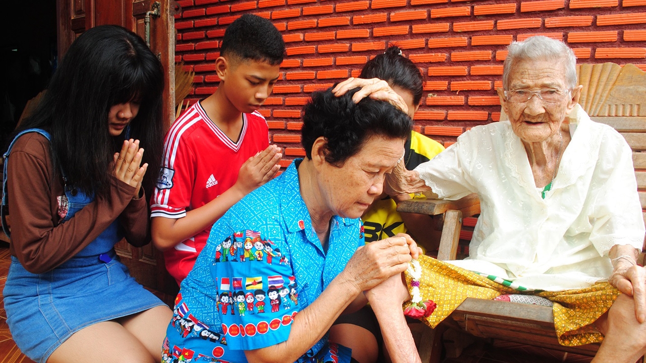 คุณยายอายุยืน 108 ปี สุขภาพแข็งแรงร่ายรำได้ สุดดีใจ เพราะวันแม่ทุกปี ลูก-หลาน-เหลน แห่กราบไหว้ขอพรที่บ้านสุโขทัย มีลูกสะใภ้คนโตดูแล จัดหาเมนูโปรดมะม่วงสุกกับปลาใส่เกลือป่นคลุกข้าวสวยร้อนๆ เหลนๆ ช่วยประคองมานั่งเก้าอี้โยกหน้าบ้านทุกเช้า...