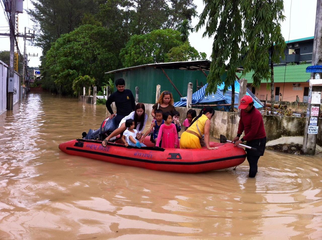 โดยมีหน่วยกู้ภัยมูลนิธิกุศลธรรมภูเก็ต นำน้ำดื่มและสิ่งของจำเป็นมามอบให้ประชาชนใช้ดื่มกินเป็นการชั่วคราว ทั้งนี้ตำรวจน้ำได้ใช้เรือยางลำเลียงหญิงสาวที่ได้รับบาดเจ็บกระดูกสันหลังเคลื่อน หลังยกของหนัก เพื่อขนย้ายสิ่งของภายในบ้านพักหนีน้ำท่วมขัง ส่ง รพ. ซึ่งเป็นไปอย่างทุลักทุเล เนื่องจากมีฝนตกลงมาตลอดเวลา เพื่อส่งต่อให้รถพยาบาลหน่วยกู้ชีพ มูลนิธิกุศลธรรมภูเก็ต ที่มาจอดประจำการณ์คอยให้การสนับสนุนตำรวจน้ำภูเก็ต และทัพเรือภาคที่ 3 ส่งรักษาตัวที่ รพ.ถลาง ต่อไป