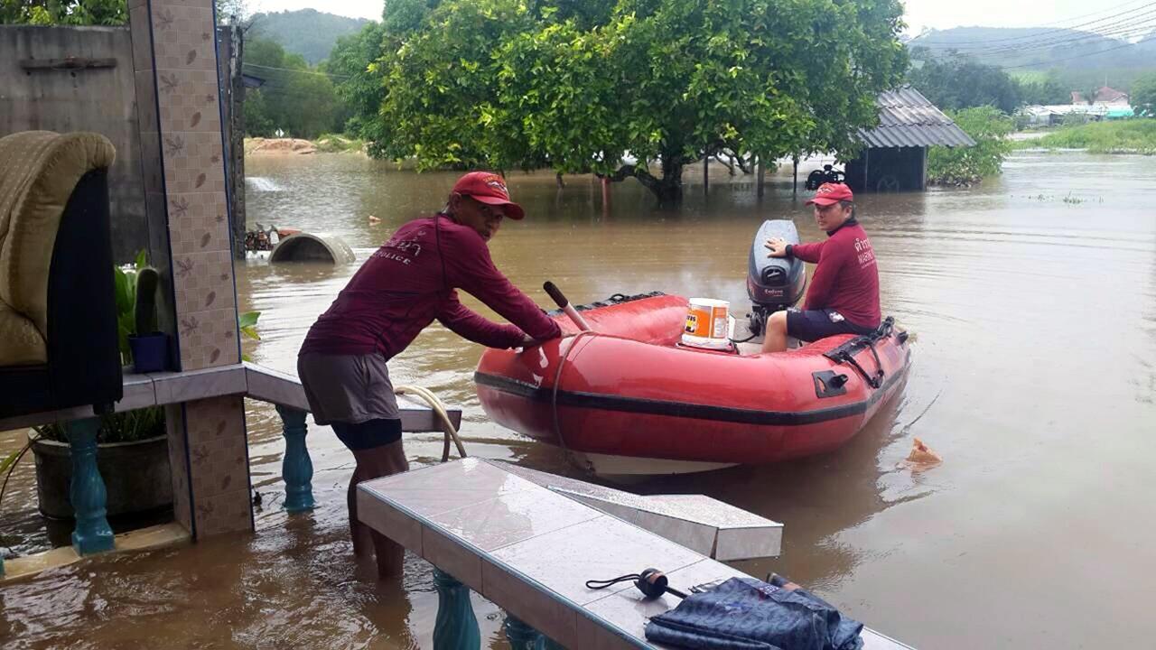 ตำรวจน้ำภูเก็ตใช้เรือยางลำเลียงหญิงกระดูกหลังบาดเจ็บเคลื่อนไหวไม่ได้ ออกจากพื้นที่ประสบภัยน้ำท่วมขัง บ้านโคกมุด ส่งโรงหมออย่างทุลักทุเล ขณะในพื้นที่น้ำยังไม่ลด