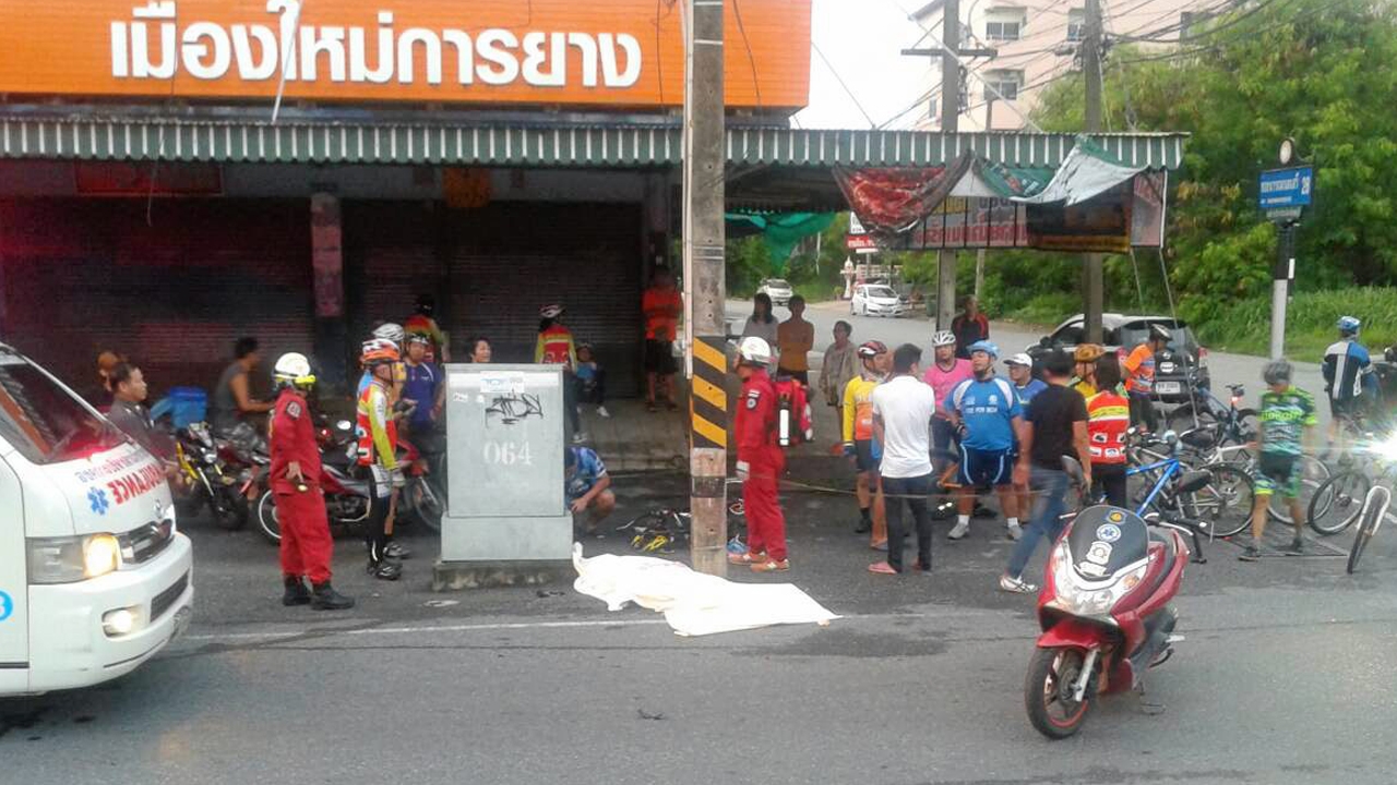ที่เกิดเหตุใกล้กับเสาไฟฟ้าหน้าร้านเมืองใหม่การยางบริเวณฟุตปาทพบศพนายธงชัย สุดศรี อายุ 56 ปี อาชีพรับจ้างทั่วไป อยู่บ้านเลขที่ 2/13 หมู่ 3 ต.บ้านสวน อ.เมืองชลบุรี ใส่ชุดปั่นรถจักรยานเสื้อสีฟ้า กางเกงสีขาวคาดดำ สภาพศีรษะแตก แขนและลำตัวมีรอยฟกช้ำ ใกล้กันพบรถจักรยานล้มอยู่ล้อหลังพังยับเยินและหมวกกันน็อกอยู่ที่พื้น