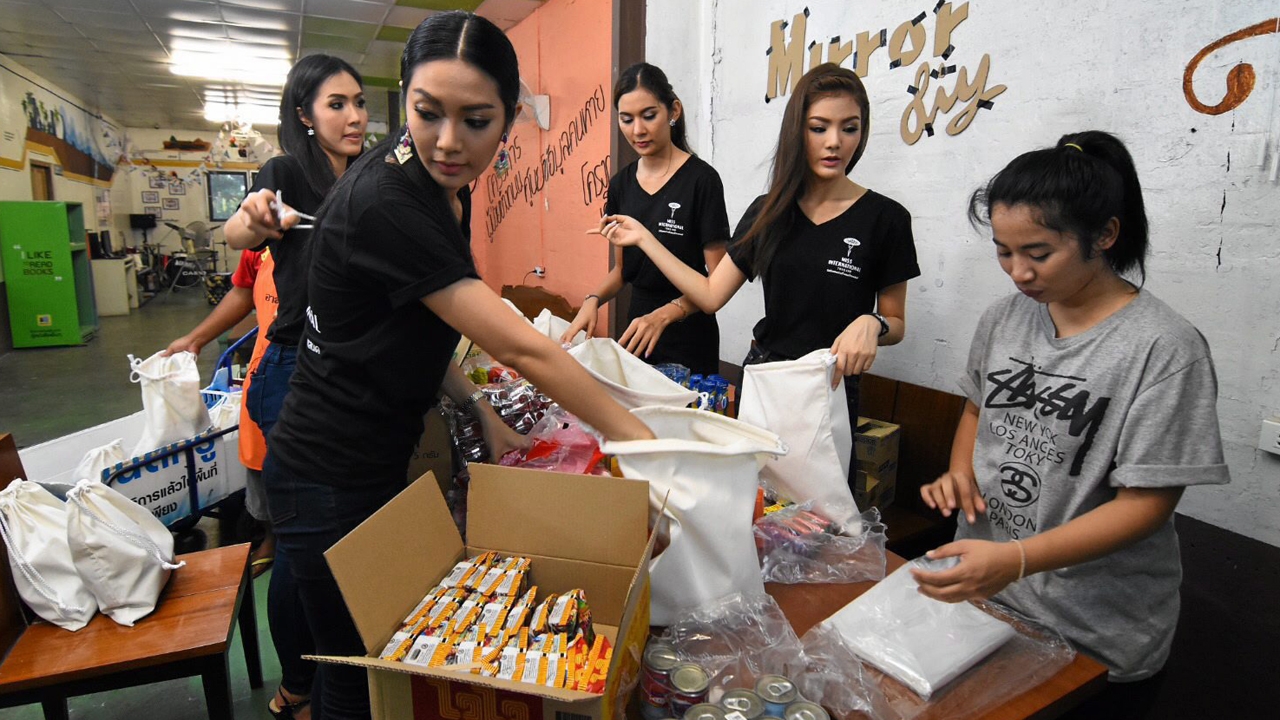 ผู้เข้าประกวดมิสอินเตอร์เนชั่นแนล ไทยแลนด์ ช่วยกันแพ็กของใส่ถุงยังชีพ ที่มูลนิธิกระจกเงา ก่อนตระเวนแจกแก่คนไร้บ้าน อันเป็นหนึ่งในภารกิจสุดท้ายของสาวงามต้องเรียนรู้การทำงานจิตอาสาเพื่อสังคม.