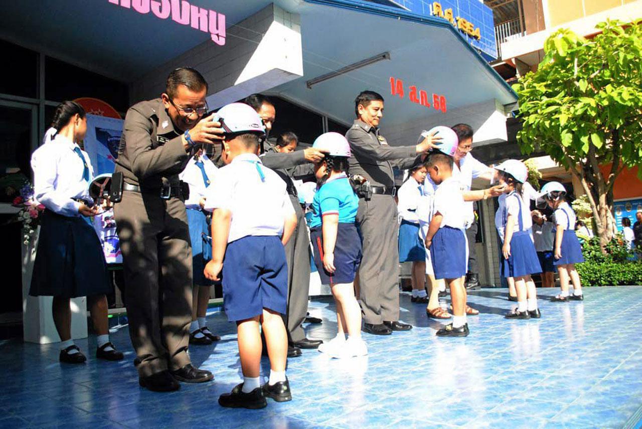 เมื่อเวลา 15.00 น. วันที่ 14 ส.ค. พล.ต.ต.ฤชากร จรเจวุฒิ ผบก.น.8 พร้อม พ.ต.อ.วิศาล พันธุ์มณี รอง ผบก.น.8 พ.ต.อ.ณัฏฐ์พัชร์ ผดุงจันทน์ ผกก.สน.บุปผาราม และ พ.ต.ท.ดร.ปราโมทย์ จันทร์บุญแก้ว สว.สส.สน.บุปผาราม ดำเนินการแจกหมวกนิรภัยตาม “โครงการหมวกกันน็อกของหนู” ให้เด็กนักเรียนอนุบาล ประถม และมัธยม ที่โรงเรียนแสงอรุณ ซอยอรุณอมรินทร์ 6 แขวงวัดกัลยาณ์ เขตธนบุรี กทม.โดยมี พ.ต.ต.พัฒนากร สูงนารถ สว.จร.สน.บุปผาราม กล่าวรายงาน พร้อมนำคณะครู อาจารย์ และนักเรียนกว่า 1,000 คน เข้าร่วมกิจกรรมและรับฟังการบรรยายถึงประโยชน์ของการสวมใส่หมวกกันน็อกจาก ผบก.น.8