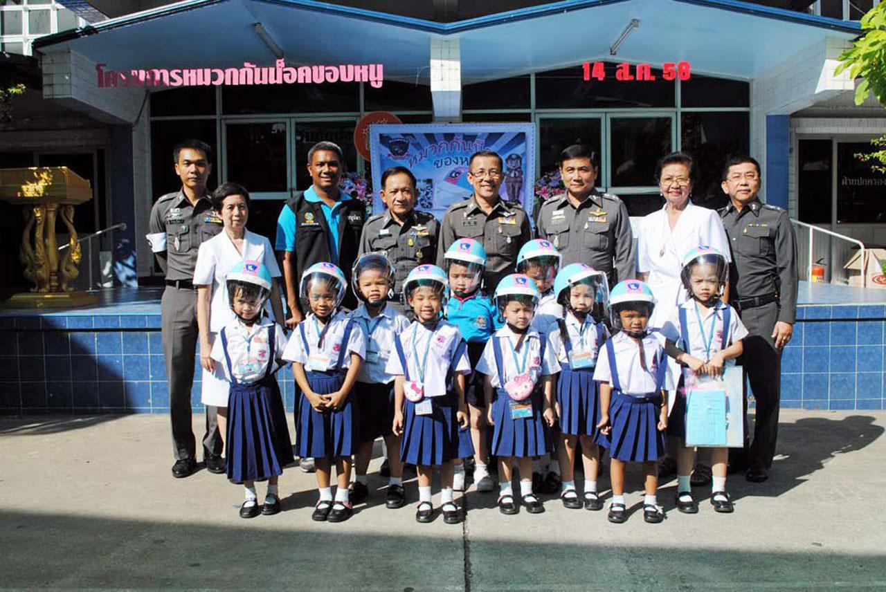 พล.ต.ต.ฤชากร กล่าวว่า วันนี้ได้นำหมวกนิรภัยที่ได้รับการรับรองมาตรฐานอุตสาหกรรม มาแจกให้น้องๆ นักเรียน จำนวน 200 ใบ คาดว่าจะแจกครบ 8,100 ใบ ในระยะเวลาอันใกล้นี้ พบเห็นสิ่งที่น่าสนใจจากสถาบันการศึกษาแห่งนี้คือ บรรดาครูอาจารย์และนักเรียนระดับมัธยมปลายให้ความใส่ใจ เล็งเห็นความสำคัญของโครงการอย่างมาก เพราะสามารถลดอัตราการบาดเจ็บและเสียชีวิตบนท้องถนนในหมู่นักเรียนได้จริง โดยทางโรงเรียนจัดให้มีการประกวดวาดภาพระบายสีตามโครงการหมวกกันน็อกของหนูขึ้น นอกจากนั้นนักเรียนระดับผู้นำในชั้นมัธยมปลายยังแสดงฝีมือการถ่ายและตัดต่อหนังสั้นเรื่องพิษภัยของการไม่สวมหมวกกันน็อก มาเป็นสื่อประชาสัมพันธ์ในโรงเรียนและนำไปโพสต์ต่อในโซเชียลมีเดียเพื่อเผยแพร่ความรู้ที่เป็นประโยชน์จึงเป็นเรื่องน่ายินดีและสมควรให้การส่งเสริม