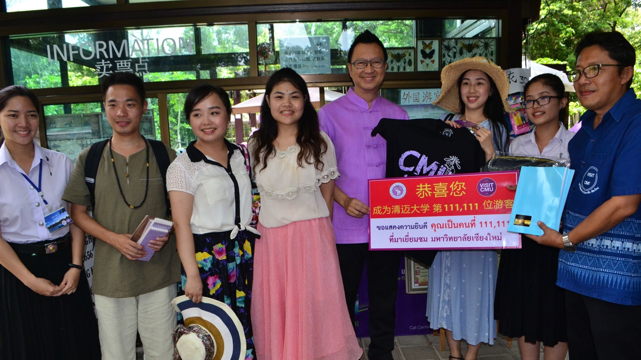 มหาวิทยาลัยเชียงใหม่ มอบป้ายแสดงความยินดีและมอบสิ่งของชำร่วย ให้กับนักท่องเที่ยวสาวชาวจีน ที่เข้ามาท่องเที่ยวลำดับ 111,111 สร้างความตื่นเต้น ให้กับนักท่องเที่ยวเป็นอย่างมาก หวังช่วยส่งเสริมการท่องเที่ยวเมืองเชียงใหม่...