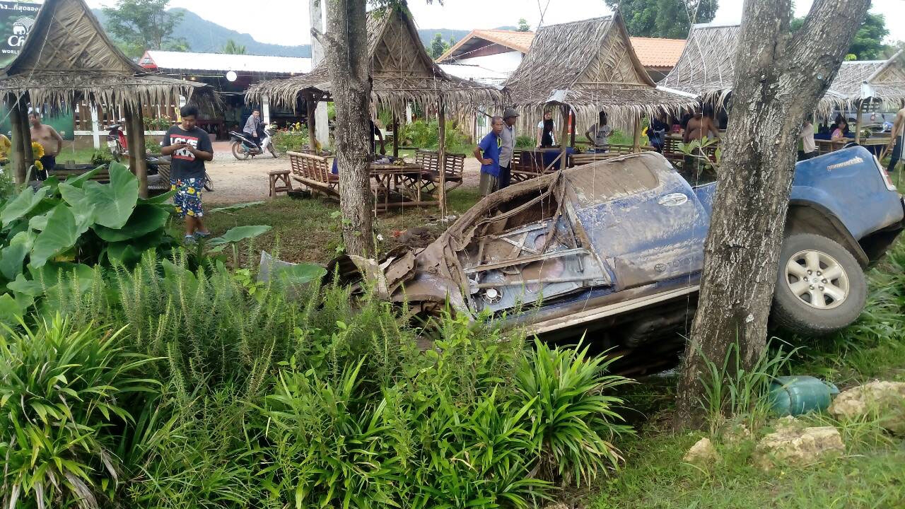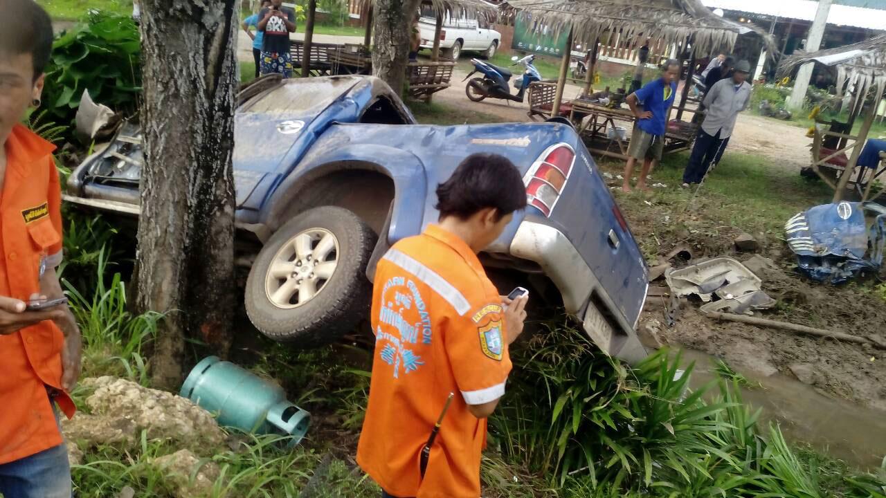 ฝนตกถนนลื่น รถกระบะเสียหลักพุ่งลงข้างทาง ริมถนนสายกาญจน์-ทองผาภูมิ ภายในพบสาวท้อง 6 เดือนบาดเจ็บแขนขวาหัก