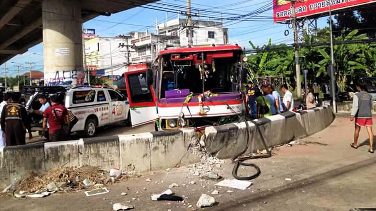 รถบัสโดยสารสายนครปฐม-บ้านแพ้วเบรกแตกพุ่งเสยแท่งปูนแบริเออร์จุดกลับรถใต้สะพาน บาดเจ็บยกคัน 14 คน ออกจากท่ารถในตัวเมือง แวะจอดรับรายทาง ระหว่างวิ่งขึ้นสะพาน เจอผู้โดยสาร 3-4 คน ยืนโบกรออยู่ใต้สะพาน ก่อนวิ่งไปยูเทิร์นแล้วย้อนมากลับรถใต้สะพาน พอใกล้ถึงทางโค้ง จู่ๆเบรกดันไม่ทำงาน โชเฟอร์กลัวพลิกคว่ำ เลยไม่กล้าหักเลี้ยวขณะยังวิ่งเร็ว ตัดสินใจพุ่งชนขอบปูนบาดเจ็บระนาว