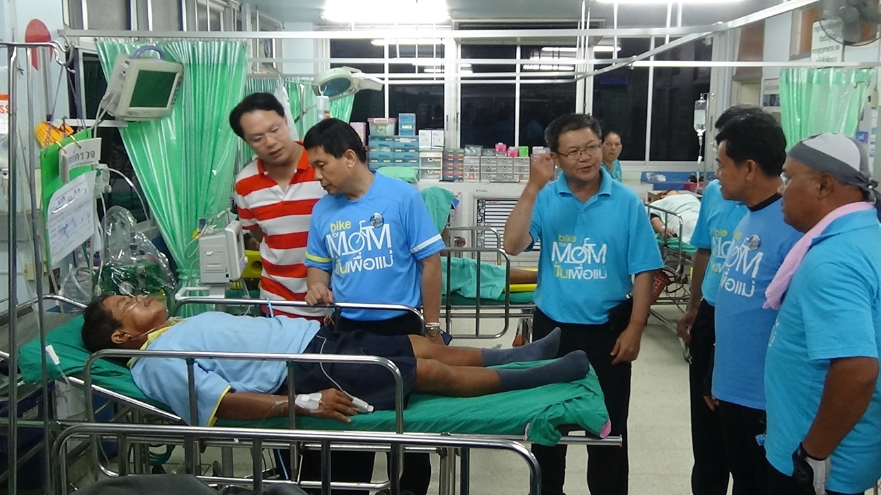 อีกราย เข้าเยี่ยม นายหลง ทำทอง อายุ 63 ปี บ้านพัก อยู่ถนนประตูกลอง ต.เวียง อ.เมือง จ พะเยา ที่ใช้รถสามล้อถีบร่วมปั่นแล้วเกิดอาการวูบเส้นเลือดฝอยแตก เจ้าหน้าที่นำส่ง รพ.พะเยา แพทย์ทำการตรวจรักษาพ้นขีดอันตรายทั้งคู่ นอนพักรักษาตัว รพ.พะเยา