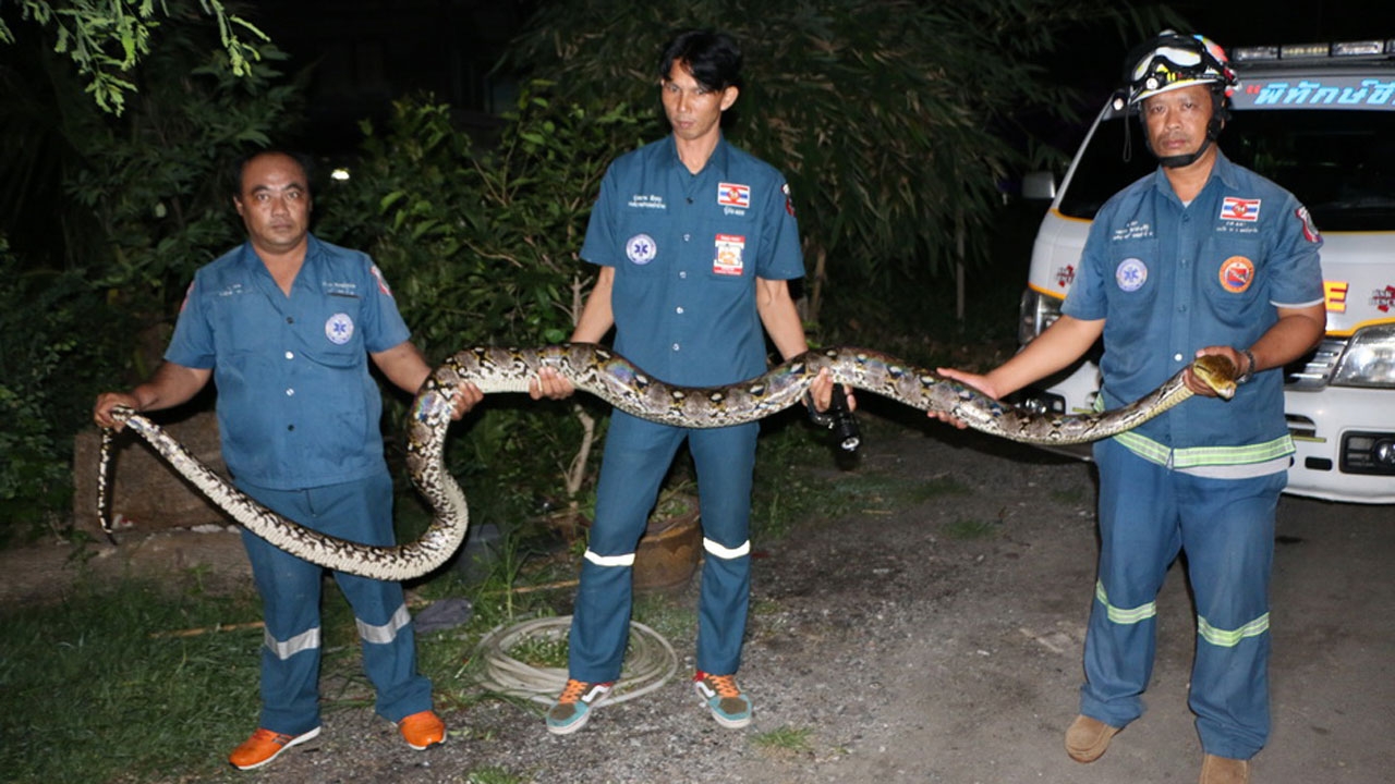 ชาวบ้านท่าข้าม จ.ฉะเชิงเทรา พบงูหลามยาว 4 เมตร กำลังพยายามเลื้อยเข้าไปในกรงเพื่อกินลูกแมว 5 ตัวที่เลี้ยงไว้ จึงใช้เชือกคล้องคอ แต่สุดท้ายงูมุดหนีอยู่ในโพรงหญ้าทำให้ต้องเรียกกู้ภัยมาจับ ใช้เวลา 5 นาทีจึงสามารถจับตัวได้
