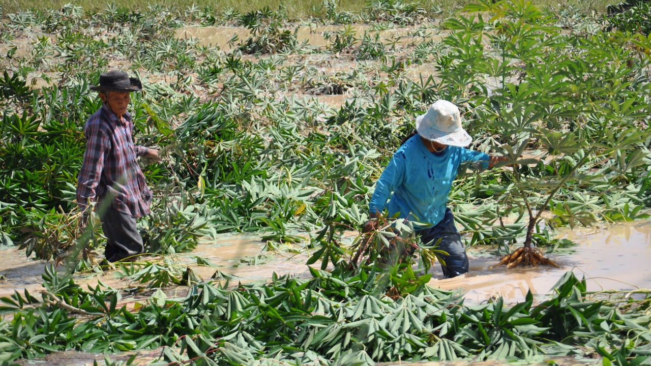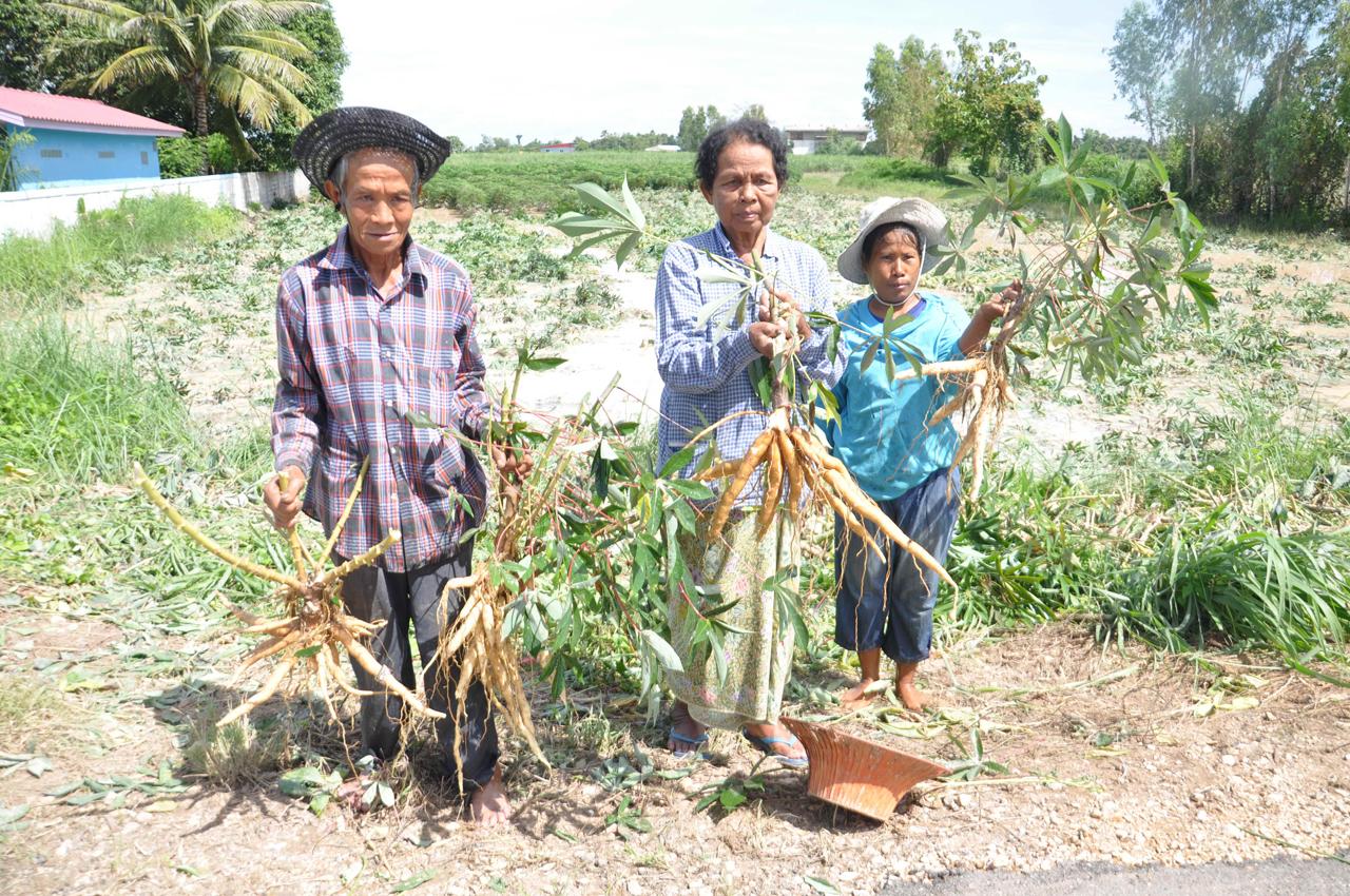 ด้านนางน้ำริน ขำแห้ง อายุ 79 ปี เกษตรกรผู้ปลูกมันสำปะหลัง เปิดเผยว่า ตนปลูกมันสำปะหลัง จำนวน 3 ไร่ ได้เพียง 4 เดือน จากนั้นเกิดฝนตกหนักติดต่อกันหลายวัน ทำให้มีน้ำไหลเข้าท่วมไร่มันสำปะหลัง จึงต้องเร่งจ้างคนงานมาเก็บเกี่ยวทั้งที่ยังไม่ได้ขนาด เนื่องจากหากแช่น้ำไว้อีก 2 วัน คาดว่าอาจจะเน่าเสียหายได้ ส่วนหัวมันสำปะหลังที่นำไปขายนั้นหัวยังเล็ก ทางลานจะรับซื้อเพียงตันละ 1,000 บาท ซึ่งต่างจากมันที่ได้ขนาดจะขายในราคาตันละ 2,800 บาท
