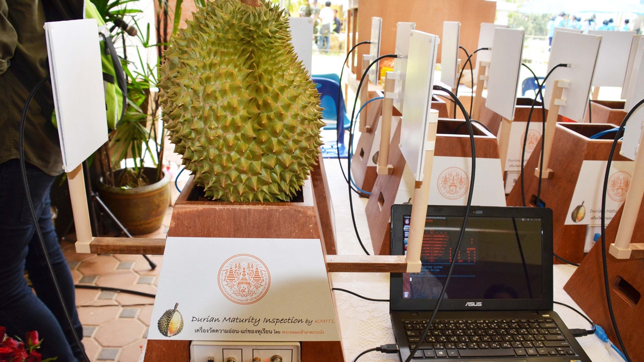 ผศ.ดร.ศรวัฒน์ ชิวปรีชา หัวหน้าภาควิชาวิศวกรรมโทรคมนาคม คณะวิศวกรรมศาสตร์ สลจ. ทีมคณะวิจัย กล่าวว่า เครื่องสแกนระบบไมโครเวฟเซ็นเซอร์ ตรวจสอบคุณภาพวัดค่าความอ่อน-แก่ของผลทุเรียน ทางภาควิชาวิศวกรรมโทรนาคม คณะวิศวกรรมศาสตร์ สจล. ได้ศึกษาวิจัยนานหลายปี จนกระทั่งสามารถย่อส่วนลงมาให้เล็กกะทัดรัด ราคาเหลือเพียงหลักหมื่นบาท เน้นการใช้งานง่าย และที่สำคัญราคาต้องไม่สูง เกษตรกรจะได้มีกำลังซื้อ ซึ่งเครื่องสามารถสแกนวัดค่าได้อย่างแม่นยำและรู้ผลเป็นภาษาไทยได้ภายในไม่ถึง 1 วินาที ว่าทุเรียนมีคุณภาพอ่อนหรือแก่
