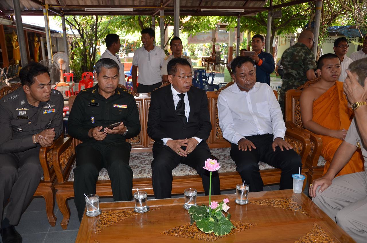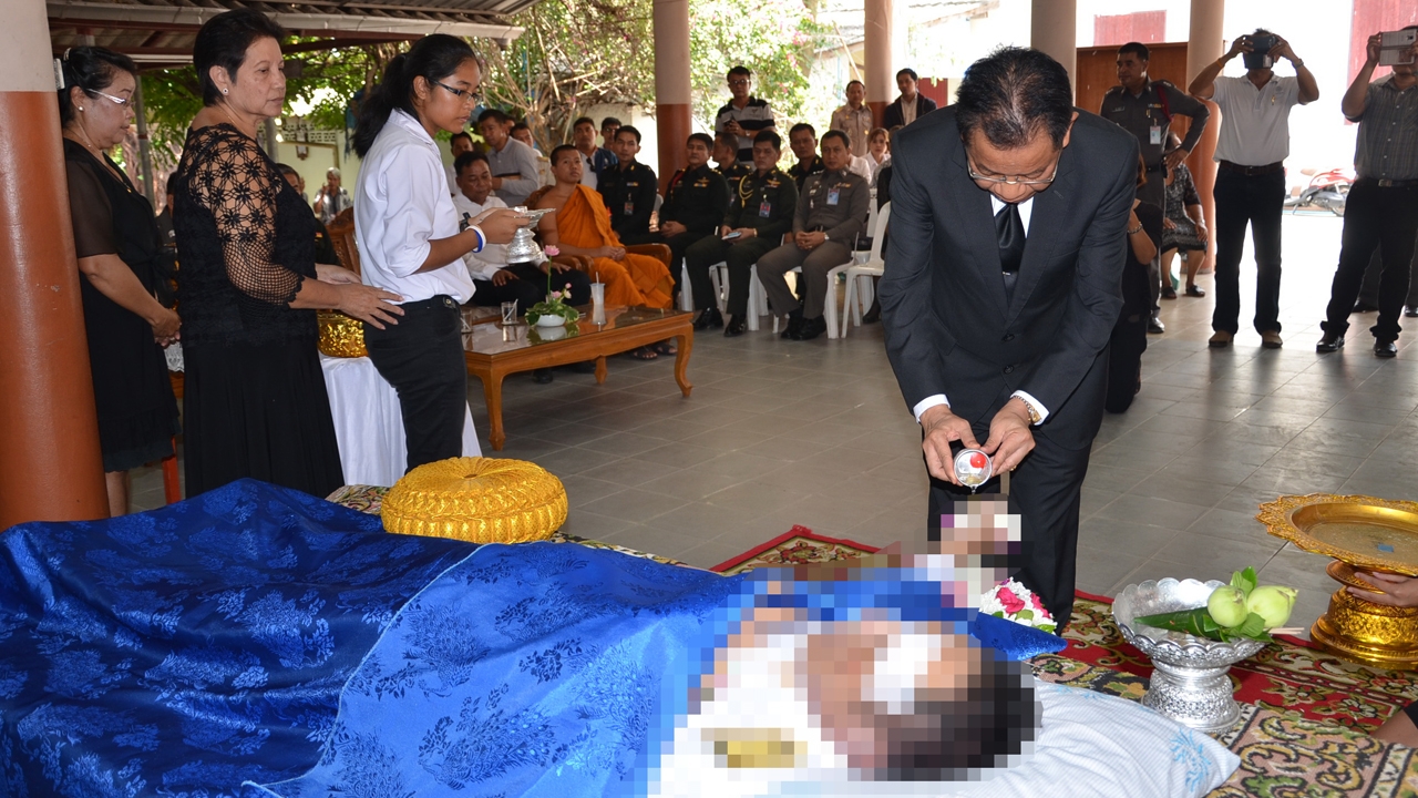 โดยมี พล.ต.วัฒนชัย ประสานเกษม รองแม่ทัพน้อยภาคที่ 4 พ.ต.อ.วันชัย เอกพรพิชญ์ รอง ผบก.ภ.จว.นครศรีธรรมราช พร้อมด้วยบรรดา หน.ส่วนราชการ ทหาร ตำรวจ และฝ่ายปกครอง และข้าราชการจากแขวงการทางนครศรีธรรมราช มาร่วมพิธีรดน้ำศพ จำนวนมาก ซึ่งมีนางจุฑามณี รุ่งกำจัด อายุ 46 ปี ทำงานเป็นลูกจ้างแขวงการทางนครศรีธรรมราช ผู้เป็นภรรยาและลูกสาววัย 17 ปี และญาติๆ มาร่วมต้อนรับคณะของ ผวจ.นครศรีธรรมราช ด้วยบรรยากาศเศร้าโศกตลอดเวลา
