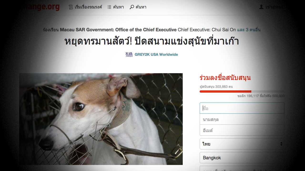 เมื่อวันที่ 17 ส.ค. มีรายงานว่า "Change.org" ประเทศไทย เว็บไซต์ซึ่งเปิดพื้นที่ให้ประชาชนนำเสนอประเด็น เพื่อรณรงค์เปลี่ยนแปลงสังคมในทางที่ดี ได้นำเสนอเรื่องราวว่าด้วยการหยุดทรมานสัตว์ โดยให้ปิดสนามแข่งสุนัขที่มาเก๊า