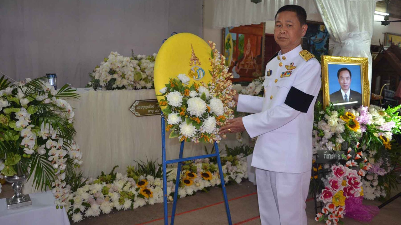 สมเด็จพระบรมโอรสาธิราชฯ พระราชทานพวงมาลาวางหน้าหีบศพนายบุญเรือง ศรีตลานนท์ เจ้าของร้านถ่ายรูปที่เสียชีวิตถูกต้นไม้หักทับขณะซ้อมปั่นจักรยานบนถนน เพื่อเข้าร่วมกิจกรรมปั่นเพื่อแม่ที่ จ.แพร่...