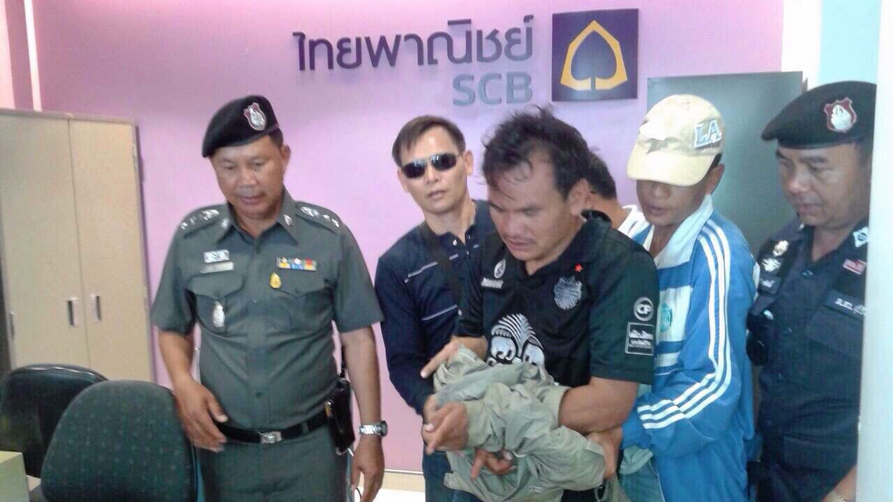 สอบสวนนายมงคล ธรณี อายุ 37 ปี รปภ.ธนาคารให้การว่า ก่อนเกิดเหตุขณะเดินดูแลความปลอดภัยอยู่หน้าประตูทางเข้าธนาคารด้านนอก เห็นคนร้ายใส่หมวกกันน็อก ขี่รถ จยย.ยามาฮ่าฟีโน่ สีแดงขาว ไม่ติดแผ่นป้ายทะเบียน มาจอดติดเครื่องไว้ข้างธนาคาร ลงจากรถถือมีดปลายแหลมเดินปรี่เข้ามาจ้วงแทง แต่ตนเอี้ยวตัวหลบทันคมมีดถูกเสื้อขาดเล็กน้อย จากนั้นคนร้ายเปิดประตูวิ่งเข้าไปในธนาคาร มือซ้ายถือมีดและมือขวาชักปืนอีกกระบอกออกมาข่มขู่พนักงานพร้อมเปิดลิ้นชักในเคาน์เตอร์ 2 และ 3 หยิบเอาเงินสดใส่กระเป๋าสะพาย แล้ววิ่งกลับมาที่ประตูจะหลบหนี แต่เจ้าหน้าที่ธนาคารกดสัญญาณเตือนภัยทำให้ประตูปิดล็อกอัตโนมัติ คนร้ายจึงใช้ด้ามมีดทุบกระจกแตกก่อนวิ่งออกมาที่จอดรถ จยย.ทิ้งไว้ แต่ขณะที่คนร้ายเข้าไปก่อเหตุในธนาคาร ตนได้ดับเครื่องรถ จยย. ล็อกคอเอากุญแจออกและล้มรถตะแคงที่พื้น พร้อมเป่านกหวีดเสียงดังตะโกนบอกชาวบ้านละแวกใกล้เคียงว่ามีการจี้ธนาคาร เมื่อคนร้ายวิ่งมาที่รถไม่สามารถขี่หลบหนีได้ เลยรีบวิ่งหนีไปทางถนนประสพสุข โดยมีชาวบ้านช่วยกันวิ่งไล่ตามไป