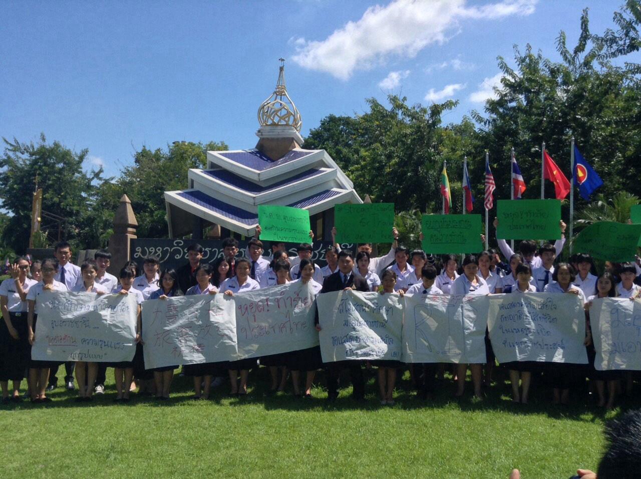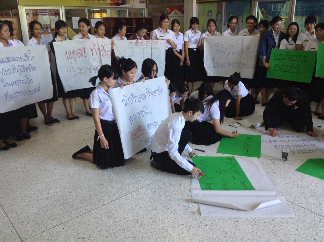 นักศึกษา ม.อุบลราชธานี ร่วมไว้อาลัยเหยื่อเหตุบึมแยกราชประสงค์ พร้อมให้กำลังใจเหยื่อและครอบครัว ก่อนเดินขบวนต้านความรุนแรง