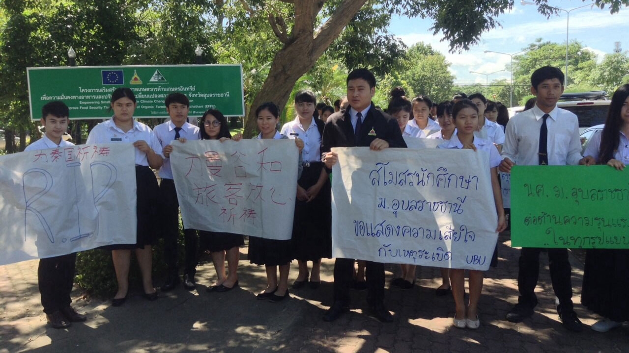 เมื่อเวลา 10.00 น. วันนี้ (19 ส.ค. 58) ที่มหาวิทยาลัยอุบลราชธานี อำเภอวารินชำราบ จังหวัดอุบลราชธานี กลุ่มนักศึกษาในนามสโมสรนักศึกษามหาวิทยาลัยอุบลราชธานี กว่า 50 คนมารวมตัว จัดกิจกรรมแสดงออกถึงการไว้อาลัยกับเหยื่อผู้เสียชีวิตจากเหตุระเบิดที่บริเวณแยกราชประสงค์ กทม. เมื่อวันที่ 17 ส.ค. โดยมีการร่วมเขียนป้ายข้อความทั้งภาษาไทย และภาษาจีน เพื่อไว้อาลัยกับผู้บาดเจ็บและเสียชีวิตจากเหตุการณ์ที่เกิดขึ้น พร้อมต่อต้านความรุนแรงในเหตุการณ์ครั้งนี้ ก่อนเดินขบวนรณรงค์ภายในสถาบันแล้วไปรวมตัวชูป้ายข้อความที่ด้านหน้ามหาวิทยาลัย ซึ่งใช้เวลาทำกิจกรรมทั้งหมดประมาณ 1 ชั่วโมง จึงแยกย้ายกันกลับเข้าเรียนด้วยความเรียบร้อย