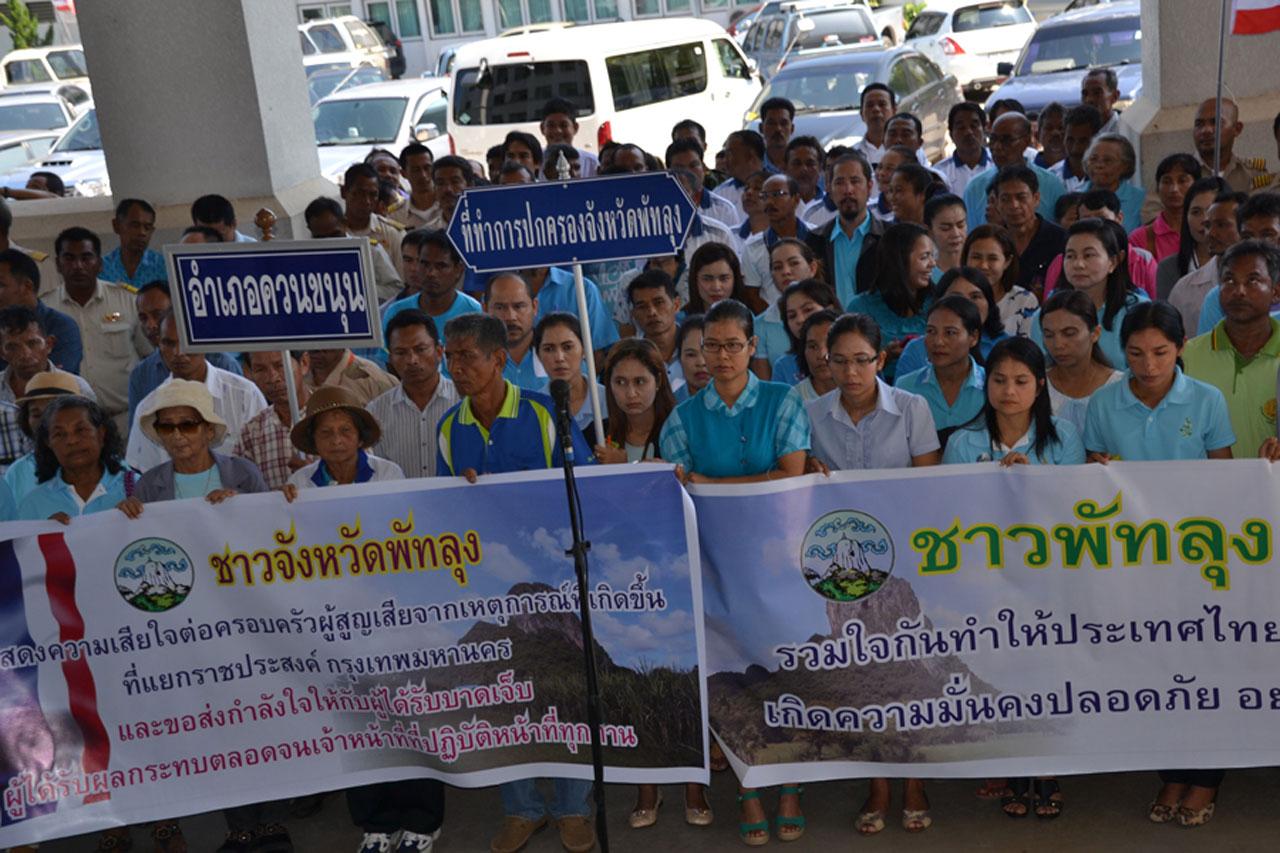 วันที่ 19 ส.ค. 58 ผู้สื่อข่าว จ.พัทลุง รายงานว่า ที่หน้าศาลากลางจังหวัดพัทลุง กลุ่มกำนัน ผู้ใหญ่บ้าน ผช.ผู้ใหญ่บ้าน ฯลฯ ทั่วจังหวัดพัทลุง ประมาณ 500 คน ภายใต้การนำของ นายปรีดา มนตรี นายกสมาคมกำนันผู้ใหญ่บ้านจังหวัดพัทลุง ได้เข้ายื่นรายชื่อกำนันผู้ใหญ่บ้าน ฯลฯ ผ่านนายวินัย บัวประดิษฐ์ ผวจ.พัทลุง เพื่อแสดงความเสียใจและประณามการใช้ความรุนแรง กรณีเหตุระเบิดที่แยกราชประสงค์ กรุงเทพมหานคร เป็นเหตุให้มีผู้ได้รับบาดเจ็บและเสียชีวิตหลายราย ทั้งยังเป็นการสร้างความเสียหายต่อชื่อเสียงของประเทศและประชาชนชาวไทย