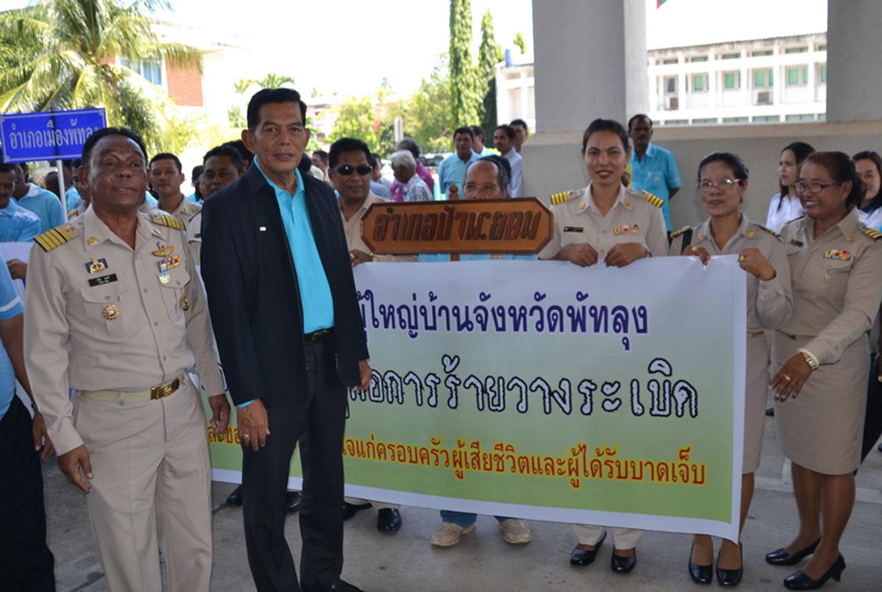 อย่างไรก็ตาม นายปรีดา มนตรี นายกสมาคมกำนันผู้ใหญ่บ้านจังหวัดพัทลุง ได้อ่านคำแถลงการณ์ ประณามการกระทำของผู้ก่อเหตุ และผู้ที่ไม่หวังดีต่อประเทศชาติ พร้อมแสดงความเสียใจอย่างสุดซึ้งต่อครอบครัวผู้สูญเสีย และเรียกร้องให้กลุ่มผู้ไม่หวังดี หยุดการกระทำที่เป็นการทำลายประเทศชาติ ในโอกาสเดียวกันนี้ นายปรีดา มนตรี นายกสมาคมกำนันผู้ใหญ่บ้าน ยังได้ร่วมกับพลังมวลชน ประกาศตั้งปณิธานว่า จะยึดมั่นในความรัก ความสามัคคี และความปรองดองสมานฉันท์ เพื่อเป็นส่วนหนึ่งให้ประเทศไทย เกิดความมั่นคง ปลอดภัยอีกด้วย.