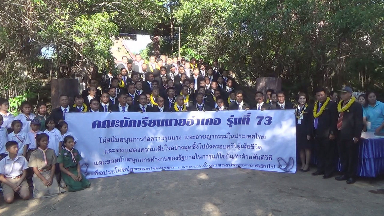 วันที่ 19 ส.ค. ที่วัดภูค่าว อ.สหัสขันธ์ จ.กาฬสินธุ์ นายสิทธิชัย เทพภูษา ผู้อำนวยการโรงเรียนนายอำเภอ วิทยาลัยการปกครอง ว่าที่ร้อยตรีอภิชัย ศรีเมือง ประธานนักเรียน นำนักเรียนโรงเรียนนายอำเภอรุ่น 73 จำนวน 98 คน ทำกิจกรรมเพื่อสังคม ด้วยการมอบทุนการศึกษา อุปกรณ์การเรียน และทำบุญทอดผ้าป่าสามัคคี พร้อมร่วมกันแสดงพลังไม่สนับสนุนการก่อความรุนแรง และอาชญากรรมในประเทศไทย และขอแสดงความเสียใจกับครอบครัวผู้เสียชีวิต สนับสนุนการทำงานของรัฐบาล ด้วยการแก้ไขปัญหาอย่างสันติวิธีเพื่อความสุขของประชาชน และความมั่นคงของประเทศไทย โดยมีว่าที่พันตรี ประพันธ์ พะบูประภาพ นายอำเภอสหัสขันธ์ ผู้นำชุมชนร่วมให้การต้อนรับ