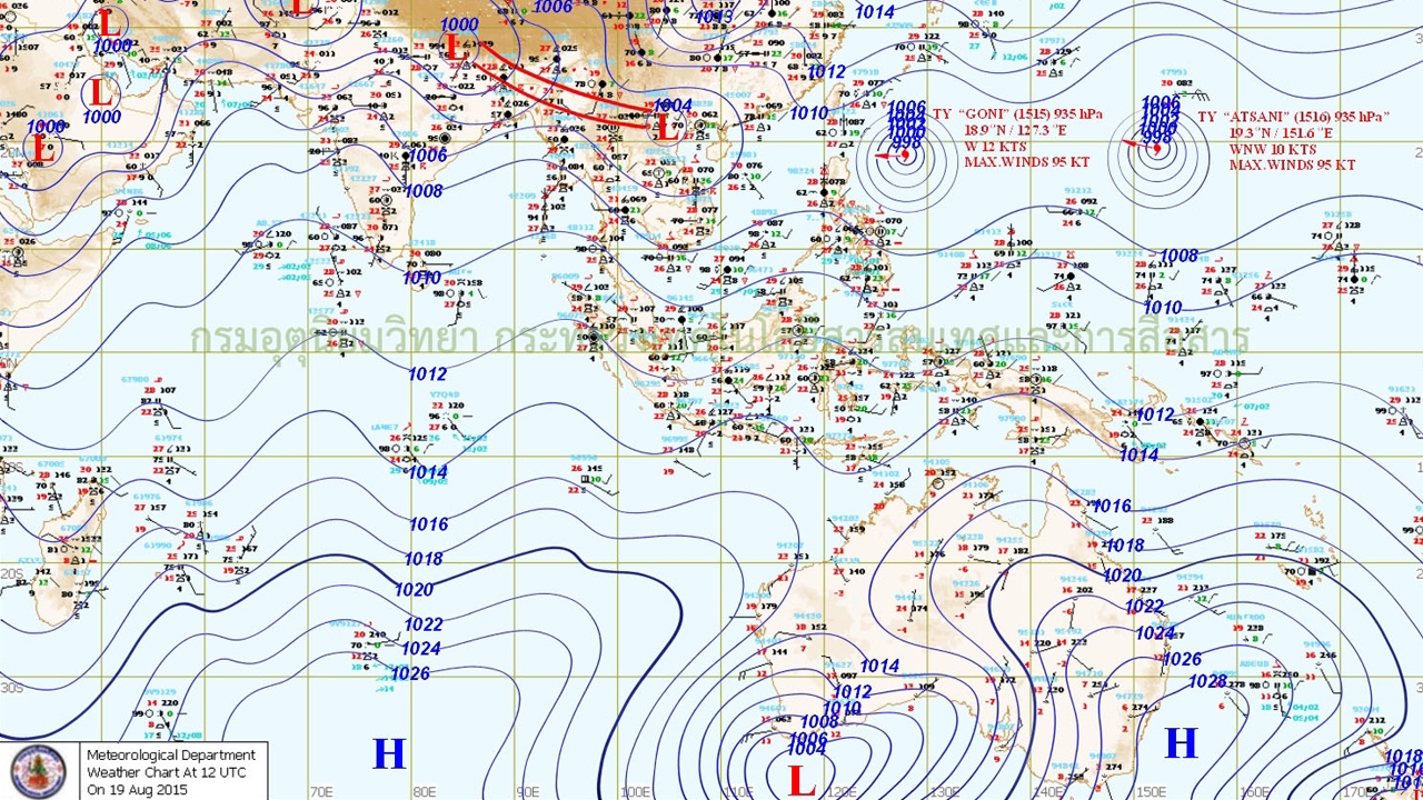 และไต้ฝุ่นระดับ 4 อัสนี มีศูนย์กลางอยู่บริเวณแปซิฟิกทางทิศตะวันออกของ เกาะอิโวโตะ ของญี่ปุ่น มีความเร็วลมศูนย์กลาง 250 กม./ชม. ห่างจากอุบลราชธานี 5,044 กม. เคลื่อนที่ทิศทางสู่เกาะฮอนชู ประทศญี่ปุ่น ด้วยความเร็ว 19 กม./ชม. คาดว่าพายุนี้จะเพิ่มความเร็วลมศูนย์กลางเป็นซุปเปอร์ไต้ฝุ่น ระดับ 5 ในบ่ายวันที่ 20 สค. แล้วลดลงเป็นไต้ฝั่นระดับ 4 ในเช้าวันที่ 21 ส.ค. หลังจากนั้นจะเปลี่ยนทิศทางกลับสู่แปซิฟิก ก่อนถึงฝั่งประเทศญี่ปุ่น พายุทั้ง 2 ลูกนี้ ยังไม่มีผลกระทบต่อสภาวะอากาศของไทย